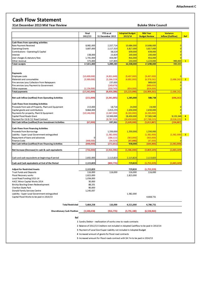 The payment of $1.582m for Unfunded Superannuation liability has been included in the cash flow statement as well as $1.686m of 2012-13 year end accrued creditors which need to be accounted for in the 2013-14 statements.  Both of these items were not accounted for in the cash flow statements presented to Council on the adoption of the budget.