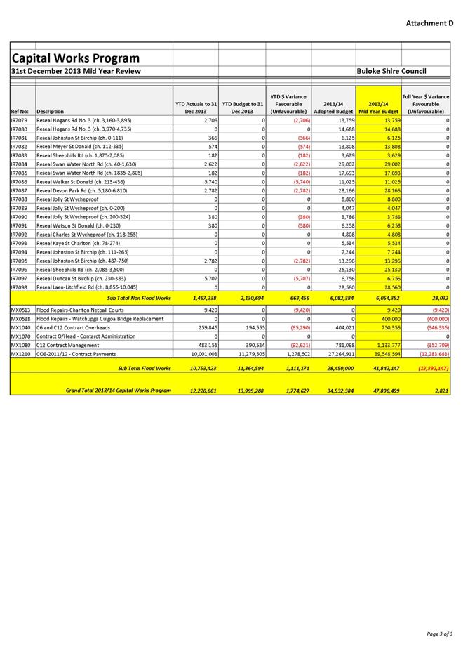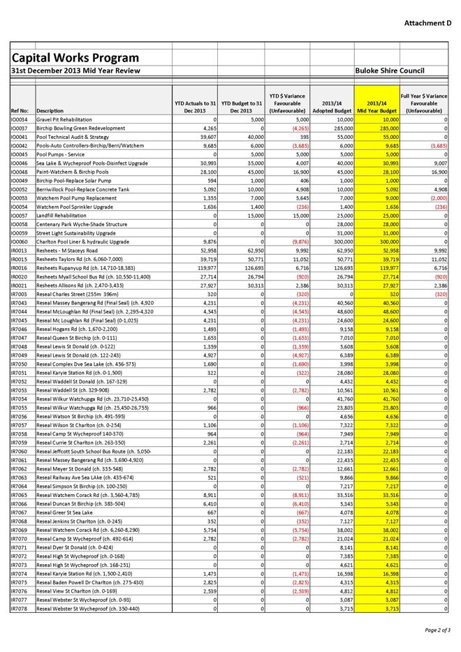 Council’s capital works will increase from the budgeted amount by $13.36m as a result of the acceleration of the flood recovery works.  Excluding the flood recovery works, there is not expected to be a significant variation in Council’s capital works expenditure for 2013-14, with a total reduction in expenditure of $28,000 to $6.05m.