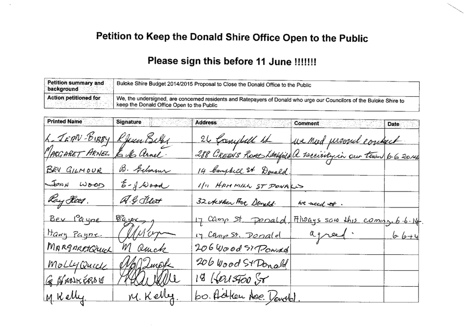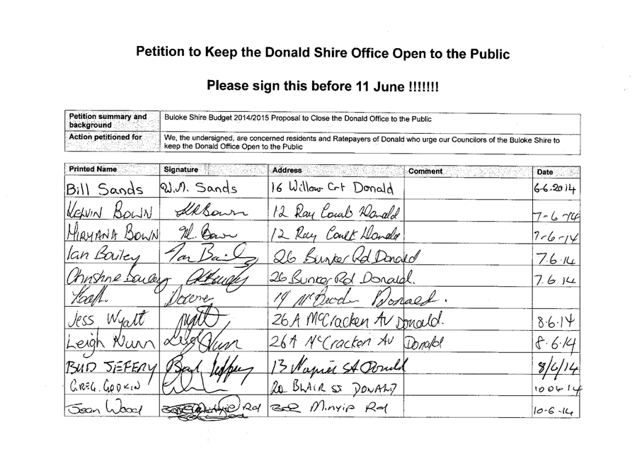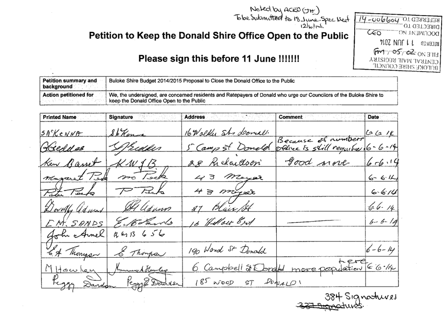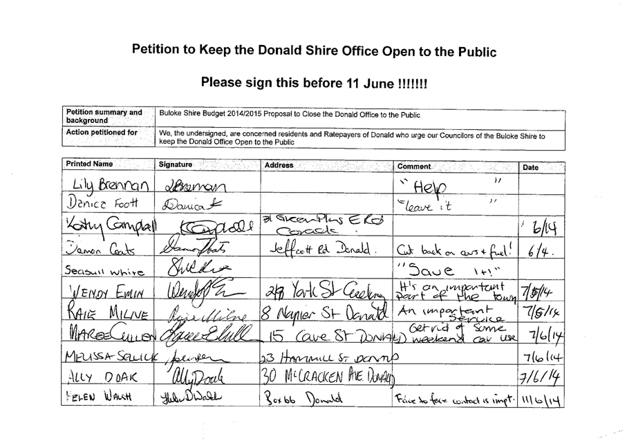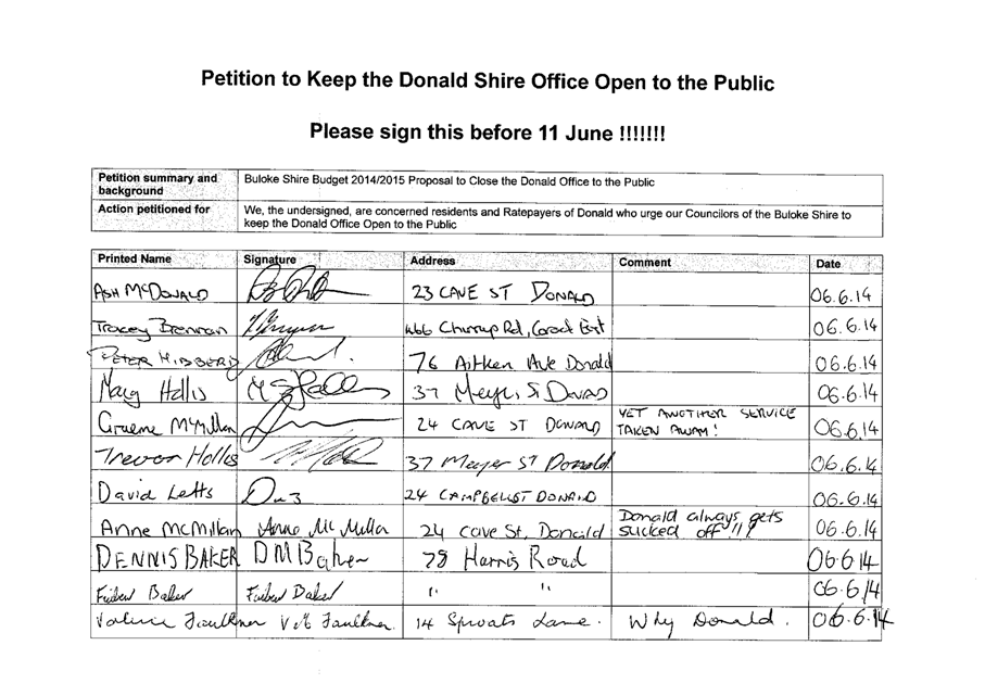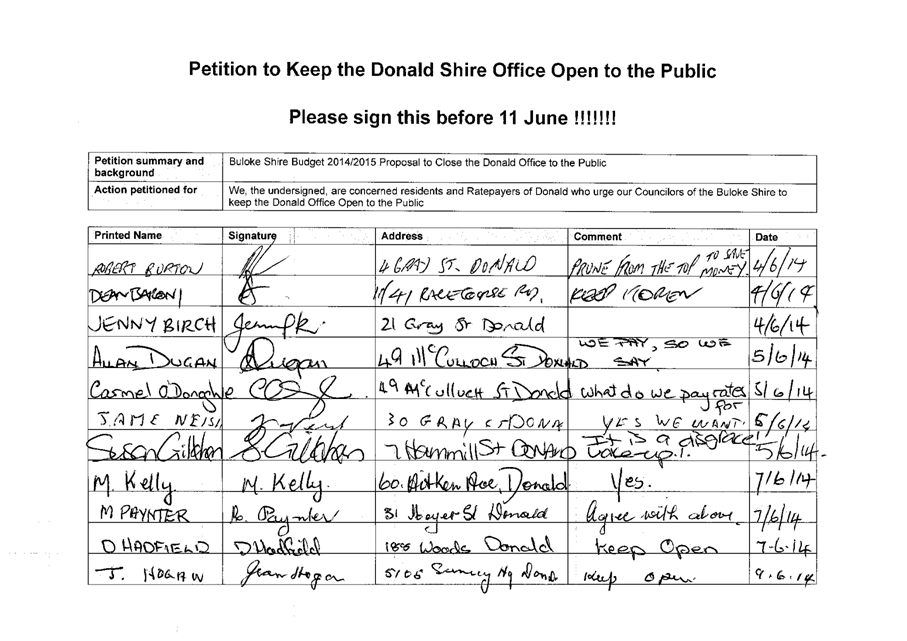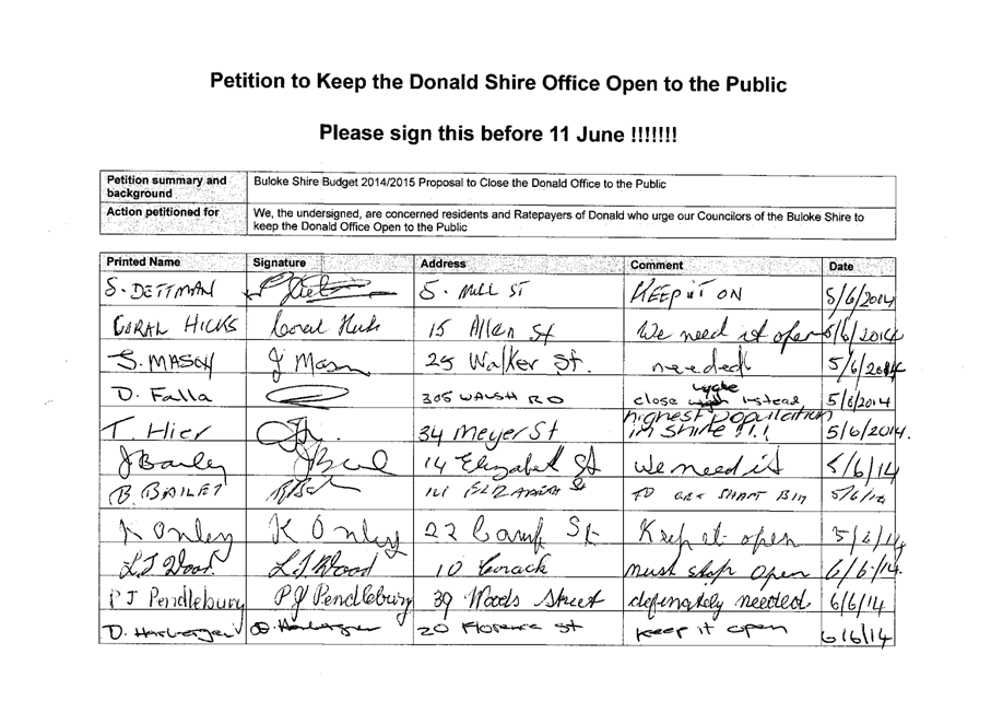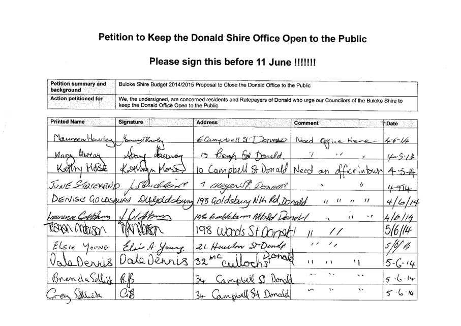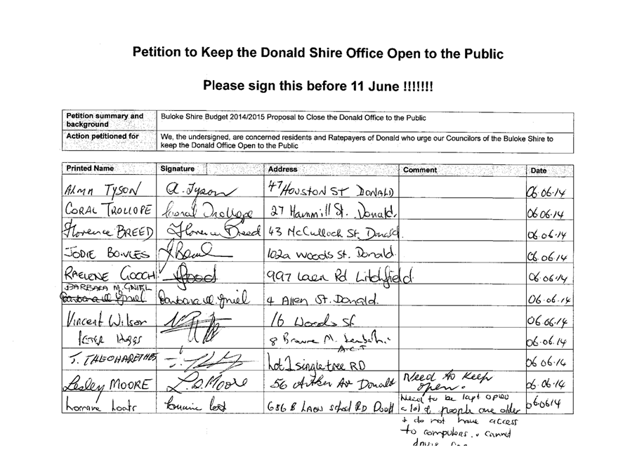A Petition supported by 384 signatures was received by Council on 11 June 2014. The petition references the Buloke Shire Budget 2014/2015 and requests “Council keep the Donald Office open to the public.”