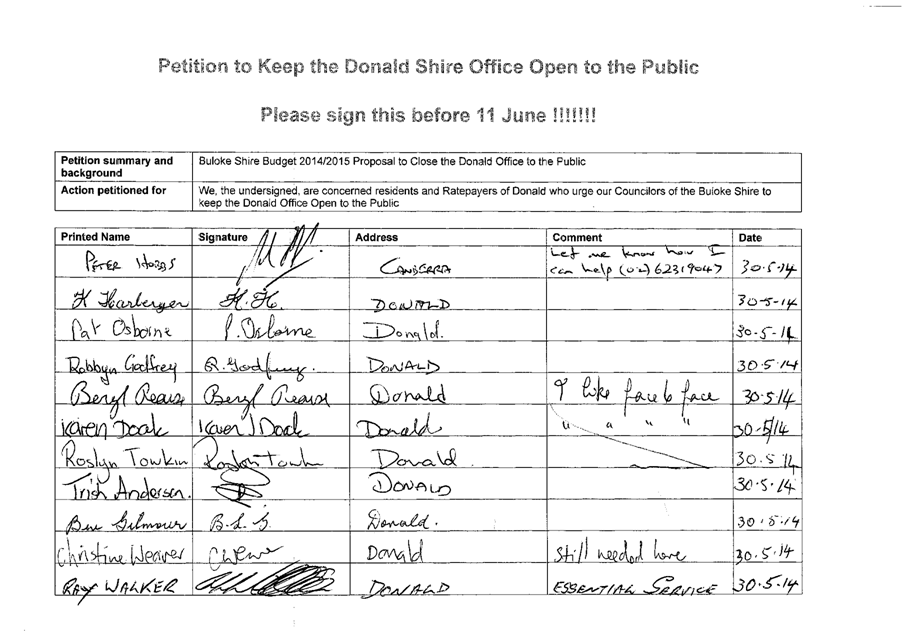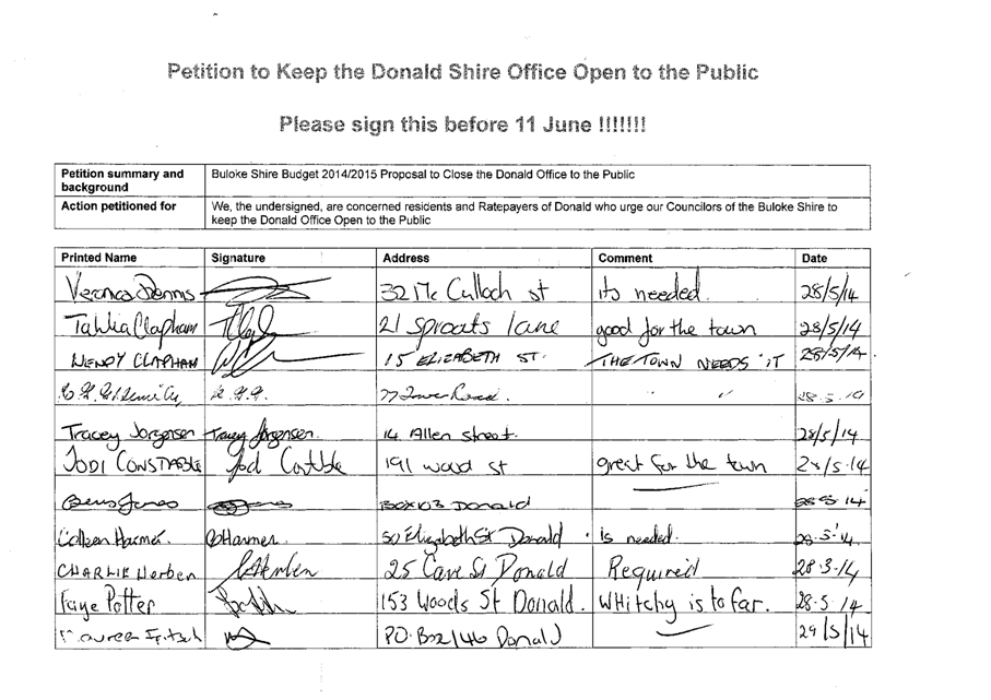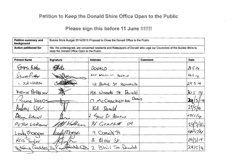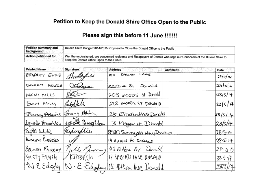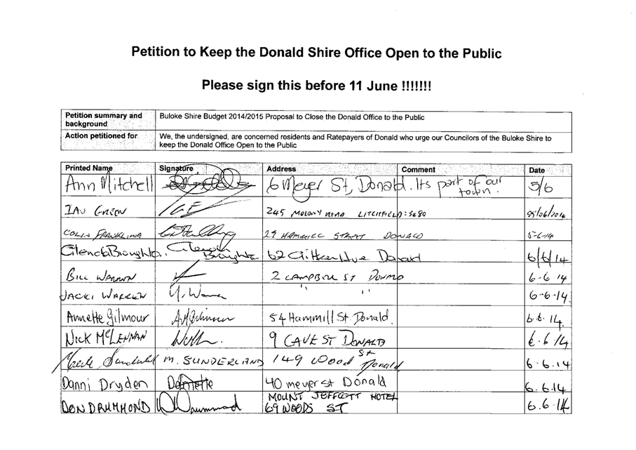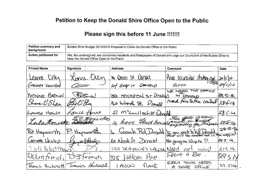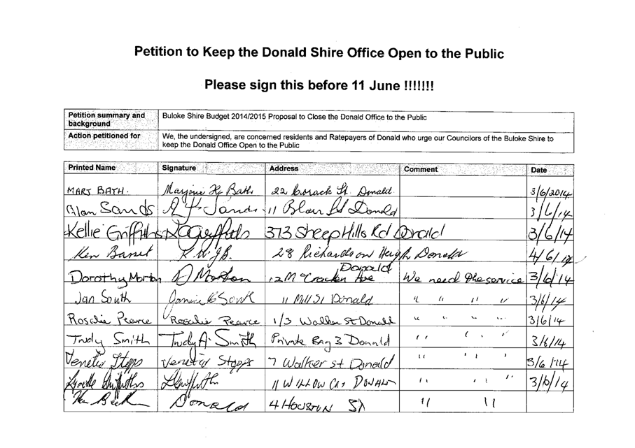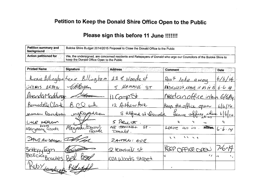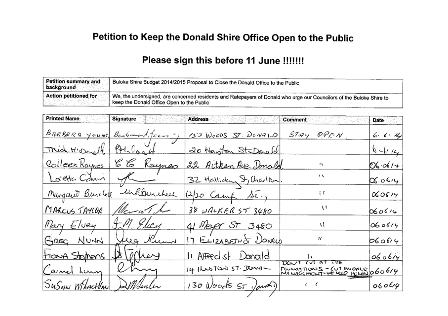 A Petition supported by 384 signatures was received by Council on 11 June 2014. The petition references the Buloke Shire Budget 2014/2015 and requests “Council keep the Donald Office open to the public.”