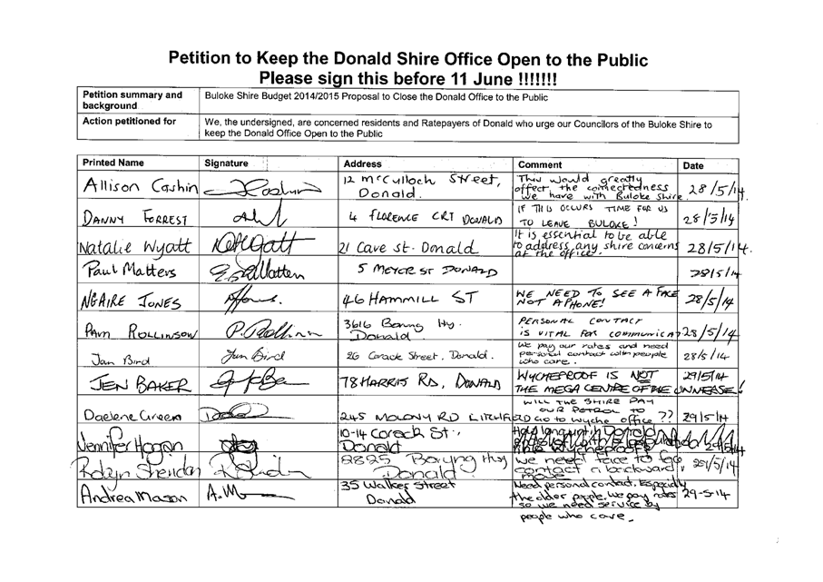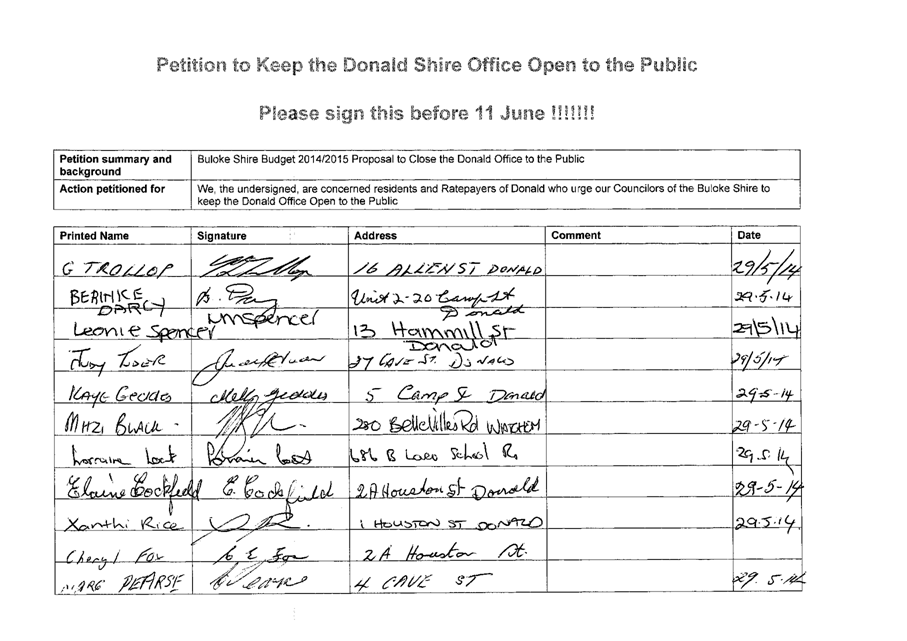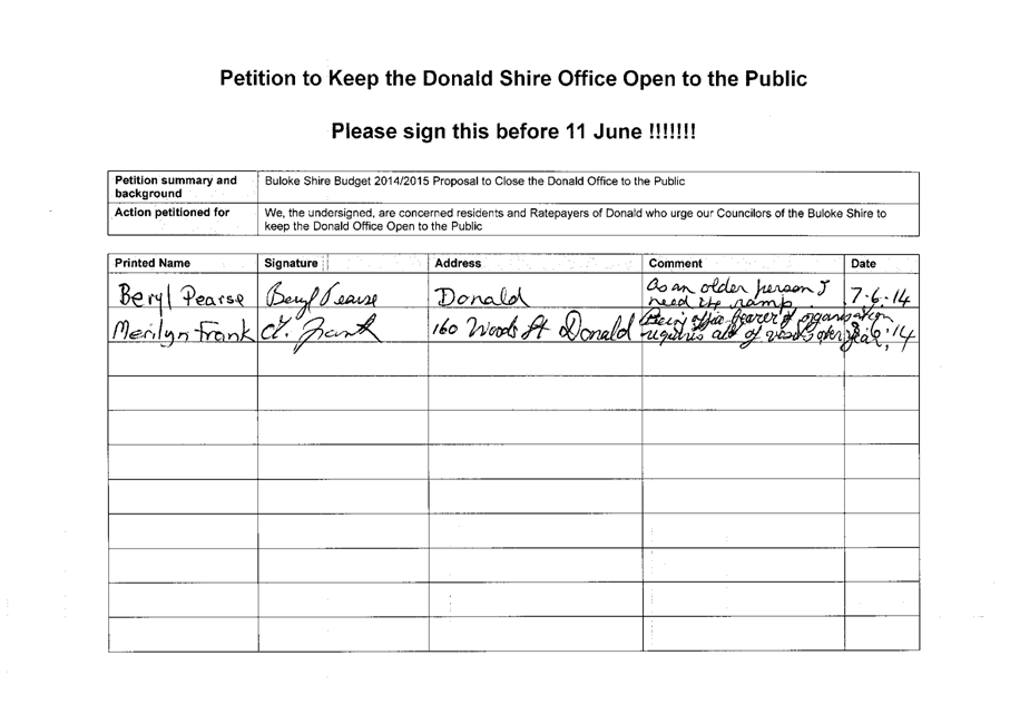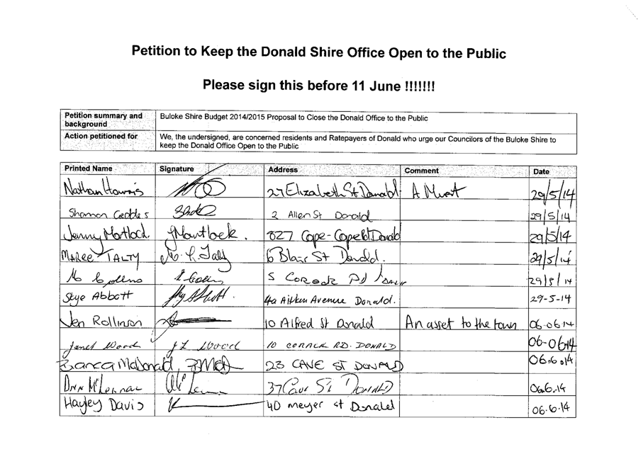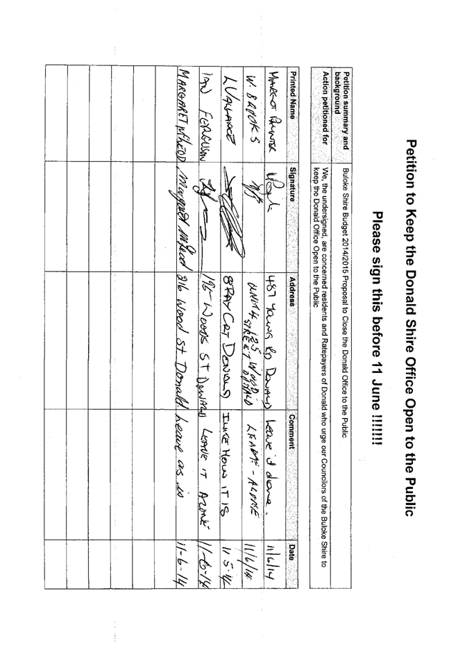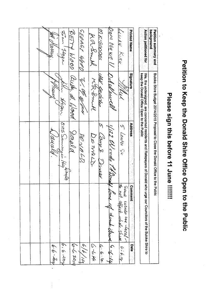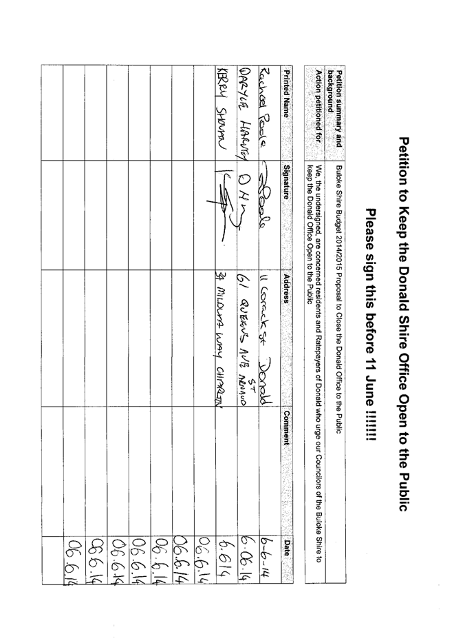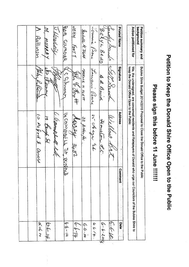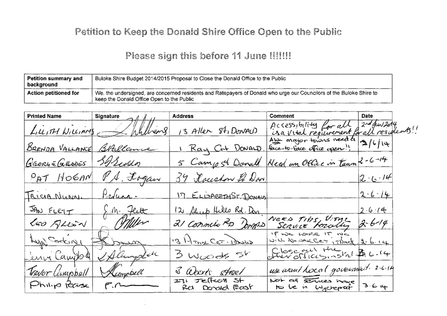 A Petition supported by 384 signatures was received by Council on 11 June 2014. The petition references the Buloke Shire Budget 2014/2015 and requests “Council keep the Donald Office open to the public.”