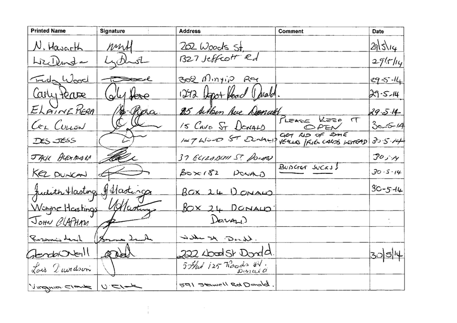 The petition arises at the same time as Council has exhibited its draft budget for public comment. The draft budget advocates the closure of face-to-face customer services at four Council offices including Donald.