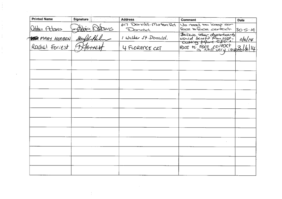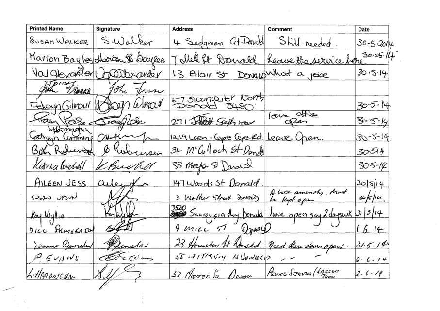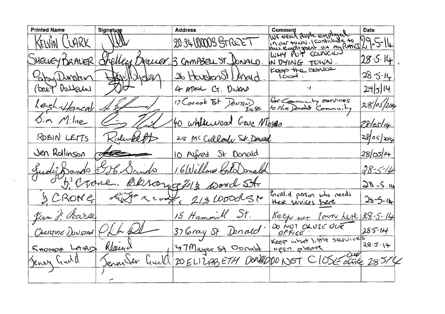That Council: 1. Accept a petition from residents and ratepayers requesting Council “keep the Donald Council Office open to the public”. The petition references the Council’s Draft 2014-2015 Budget. |