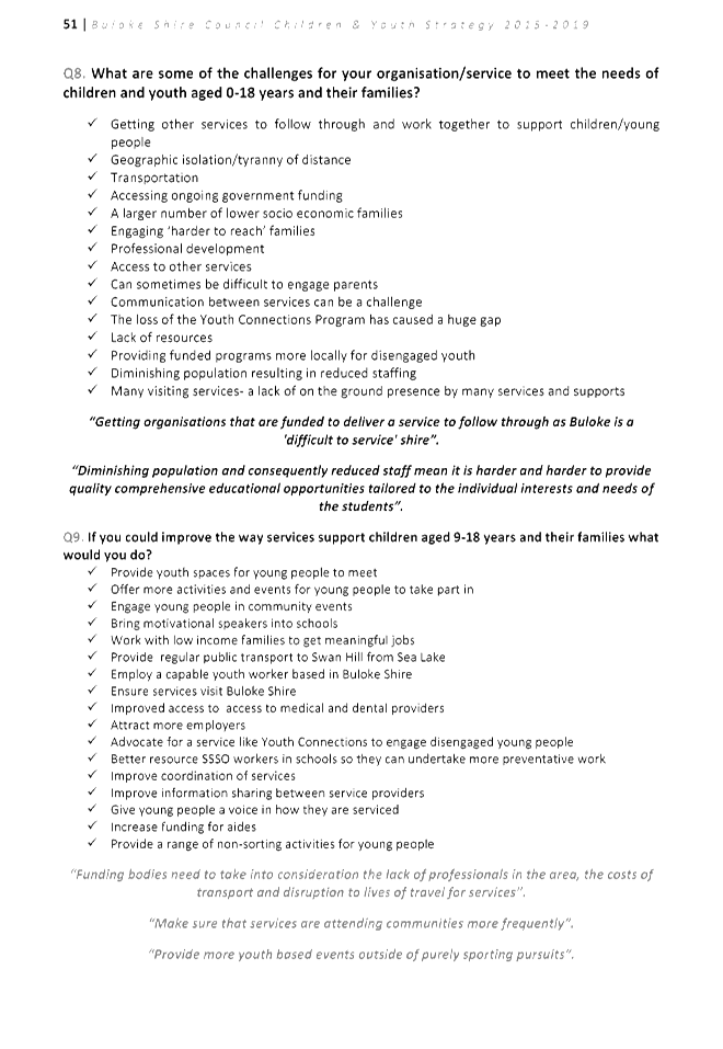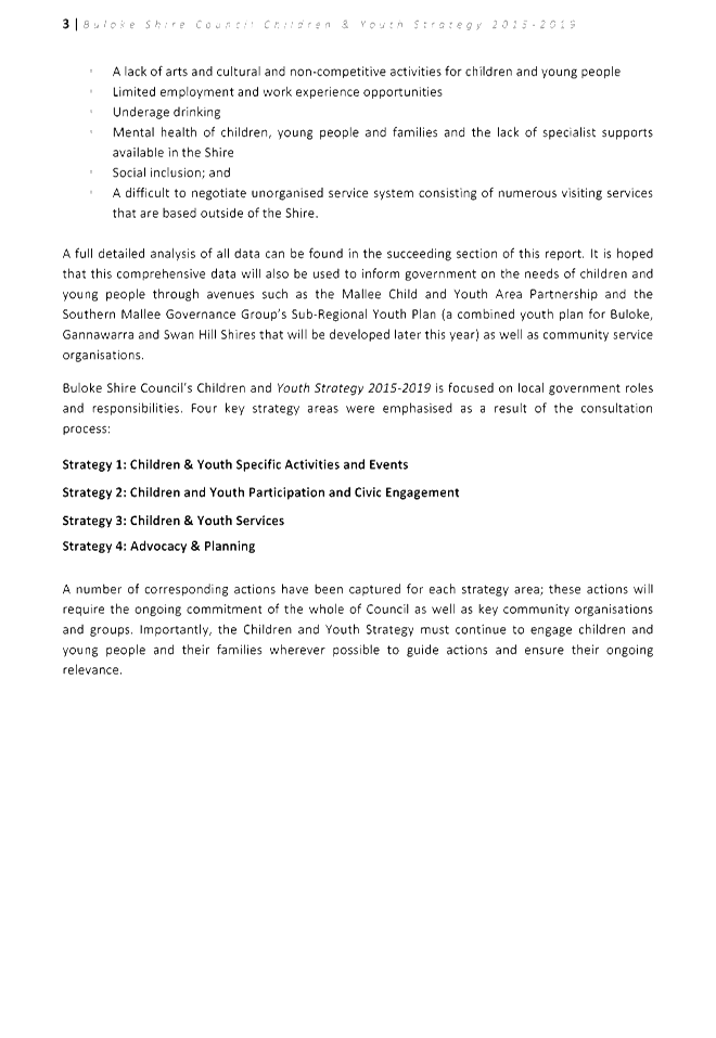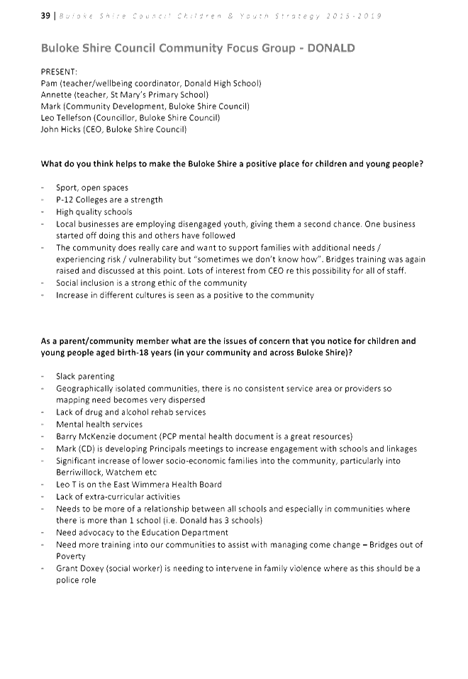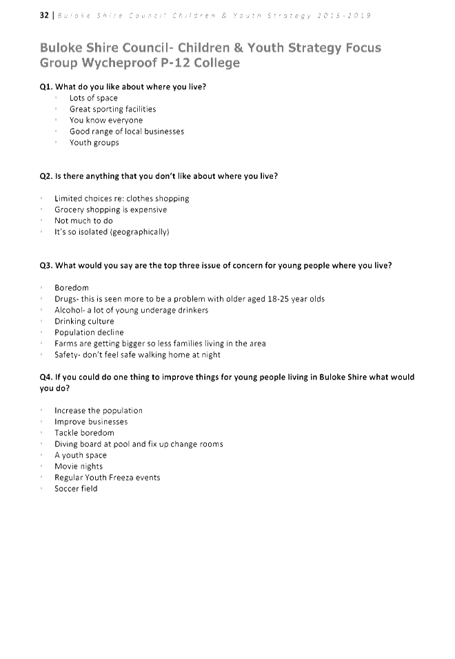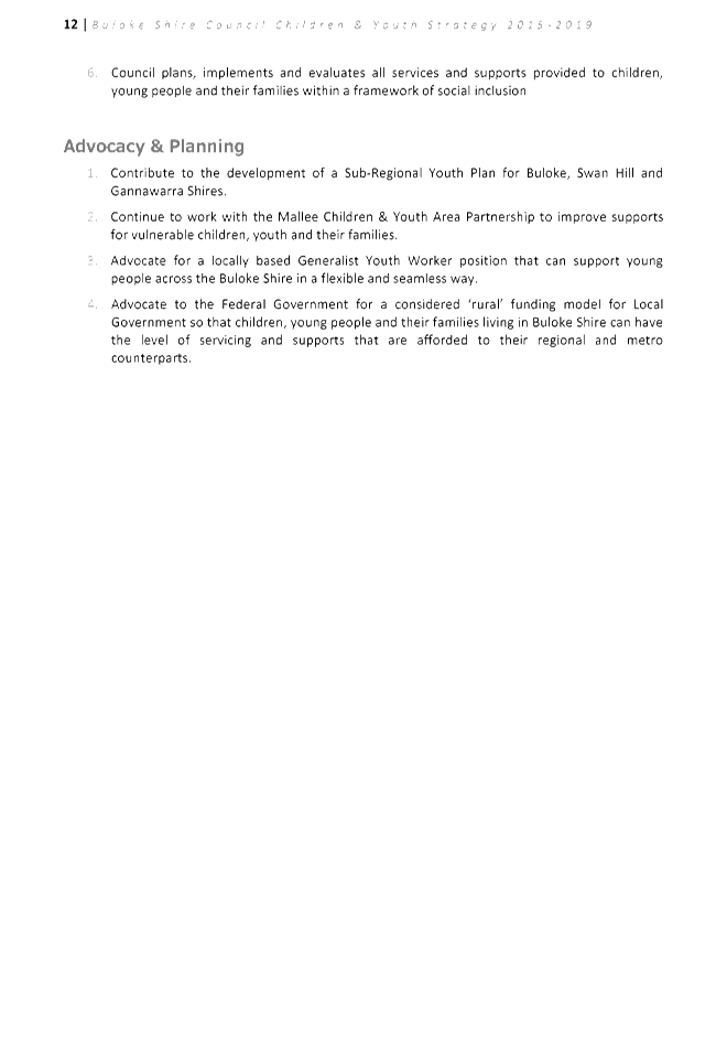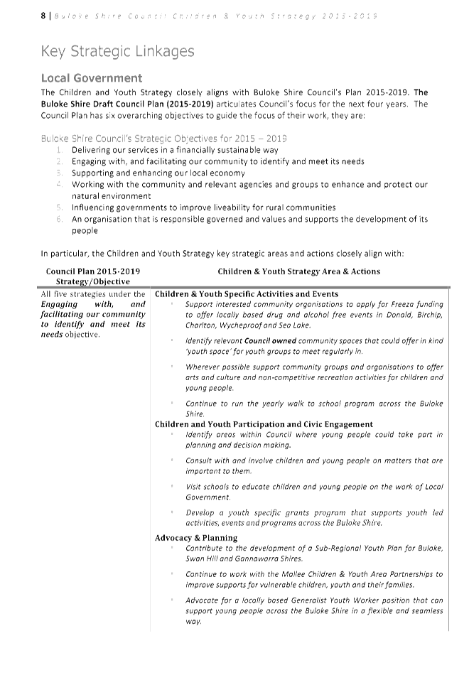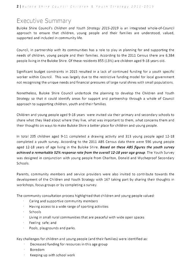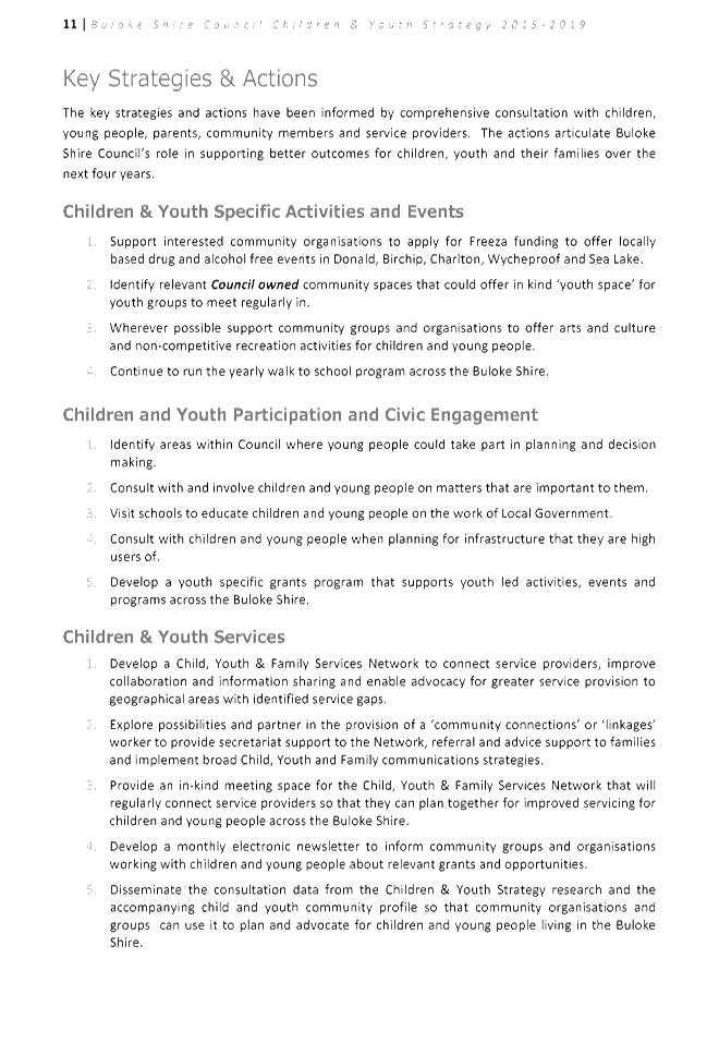 The draft Children and Youth Strategy 2015-2019 is an integrated whole-of-Council approach to ensure that children, young people and their families are understood, valued, supported and included in community life in Buloke.