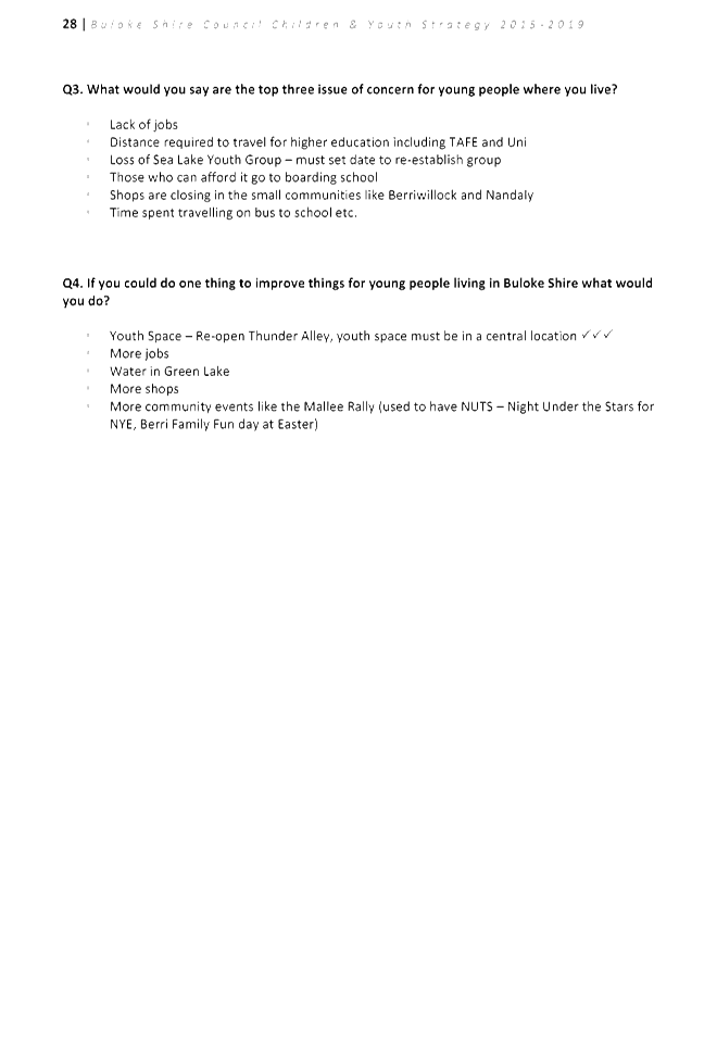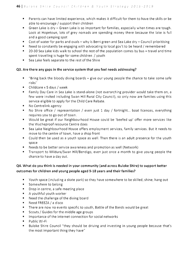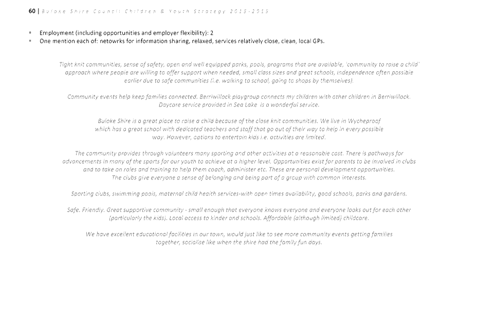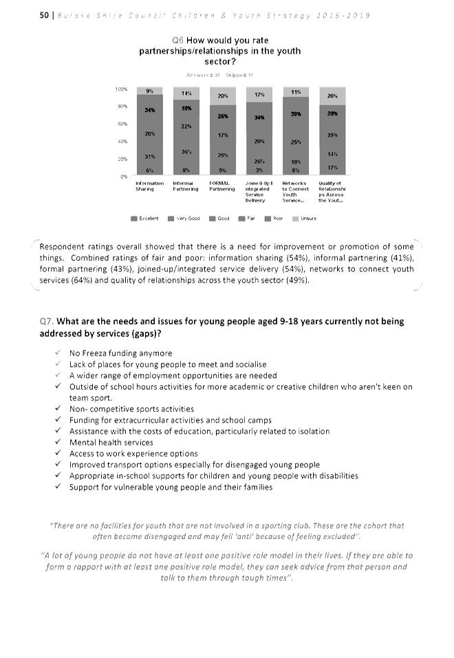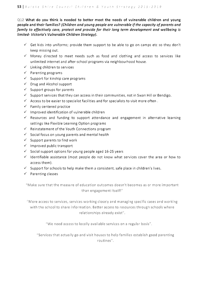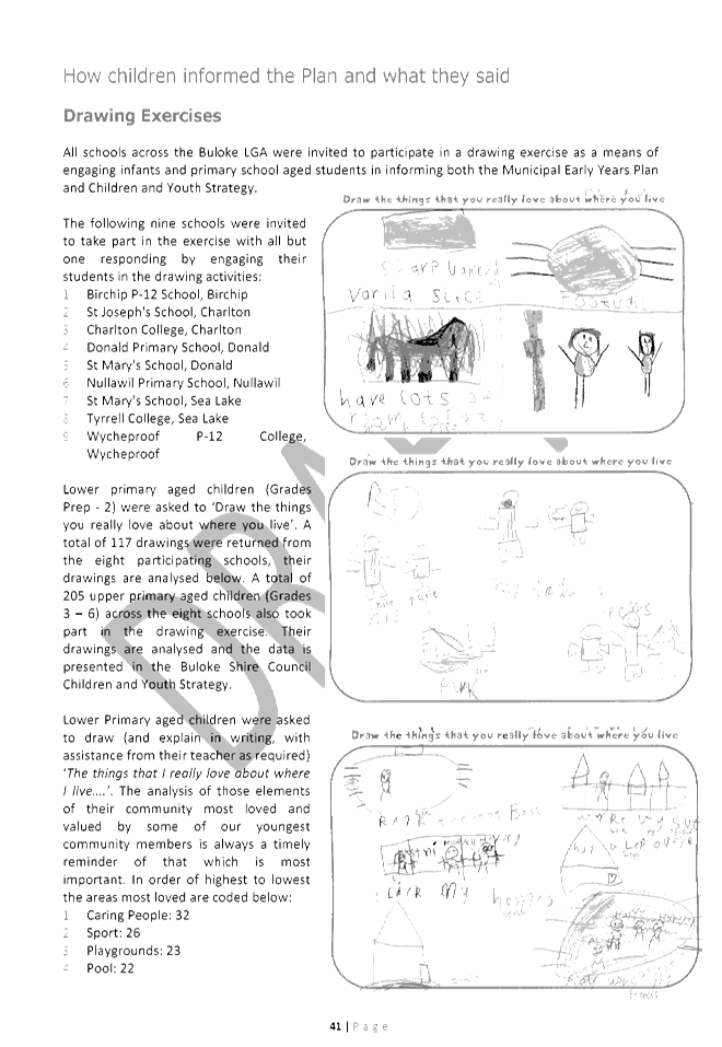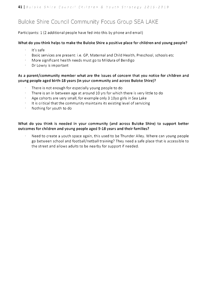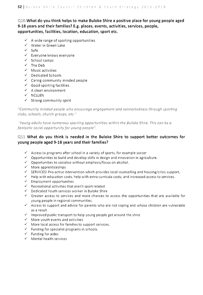 The draft Children and Youth Strategy 2015-2019 is an integrated whole-of-Council approach to ensure that children, young people and their families are understood, valued, supported and included in community life in Buloke.