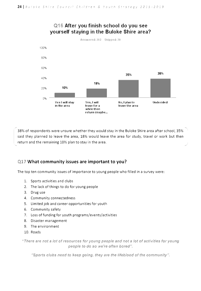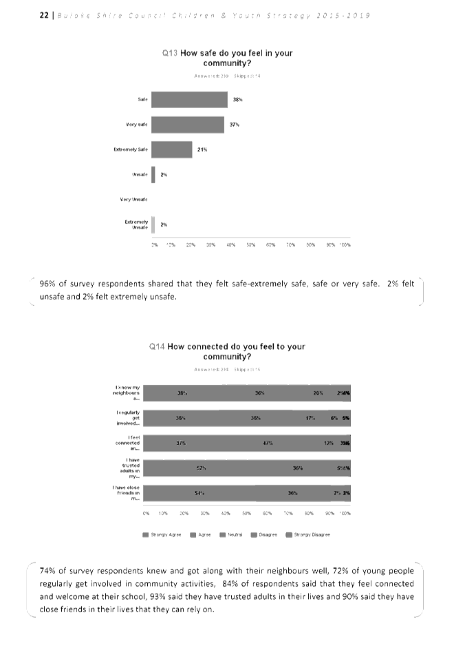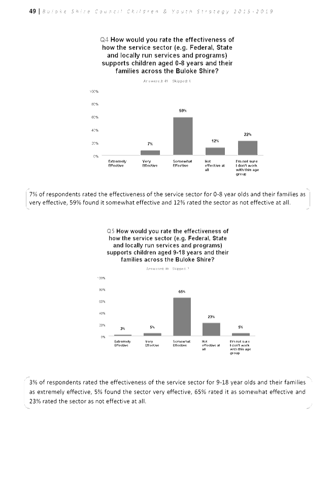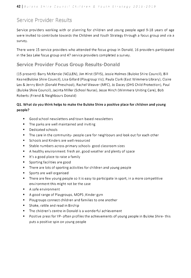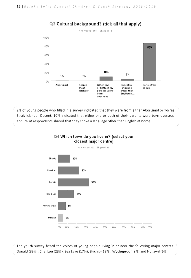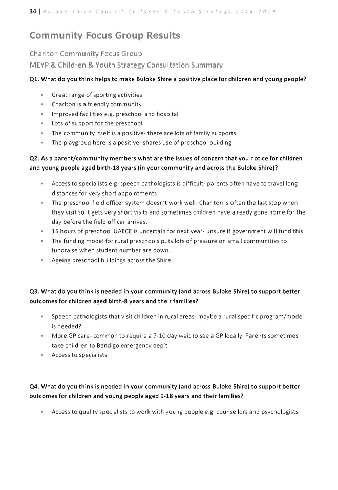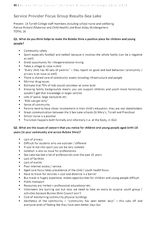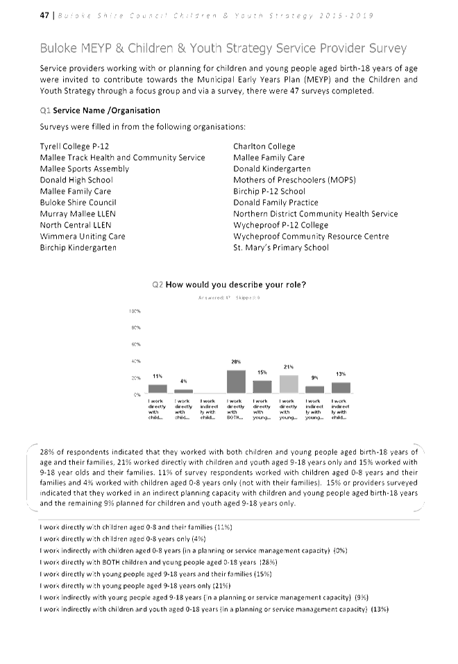 The draft Children and Youth Strategy 2015-2019 is an integrated whole-of-Council approach to ensure that children, young people and their families are understood, valued, supported and included in community life in Buloke.