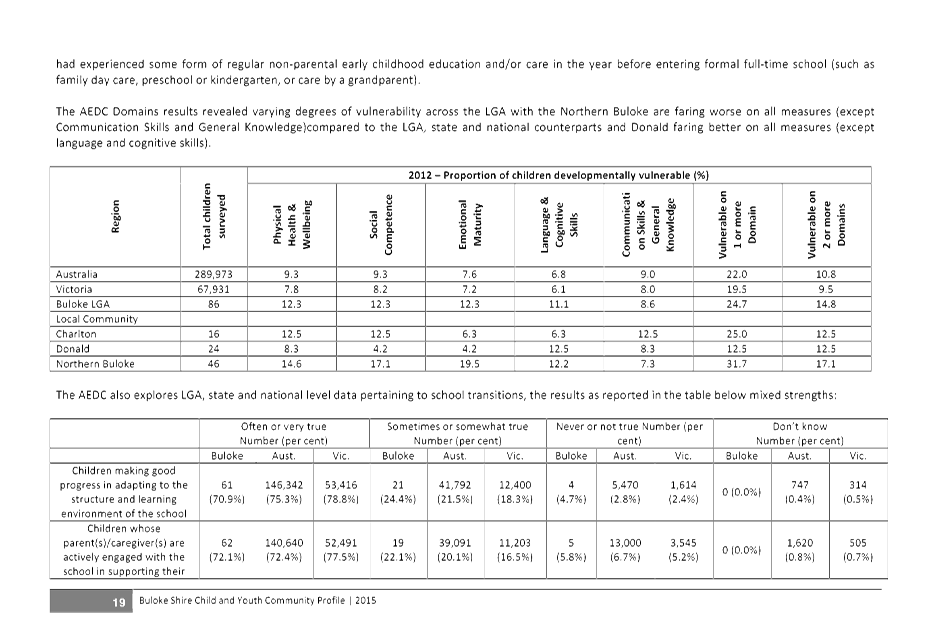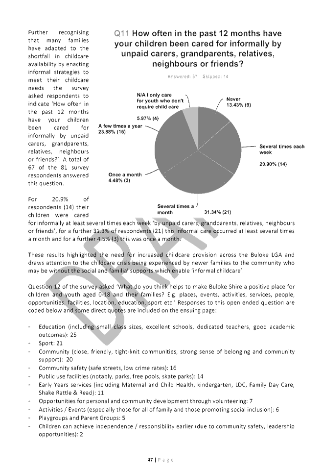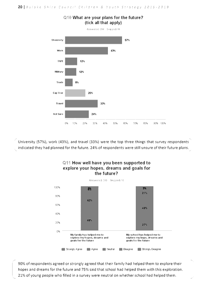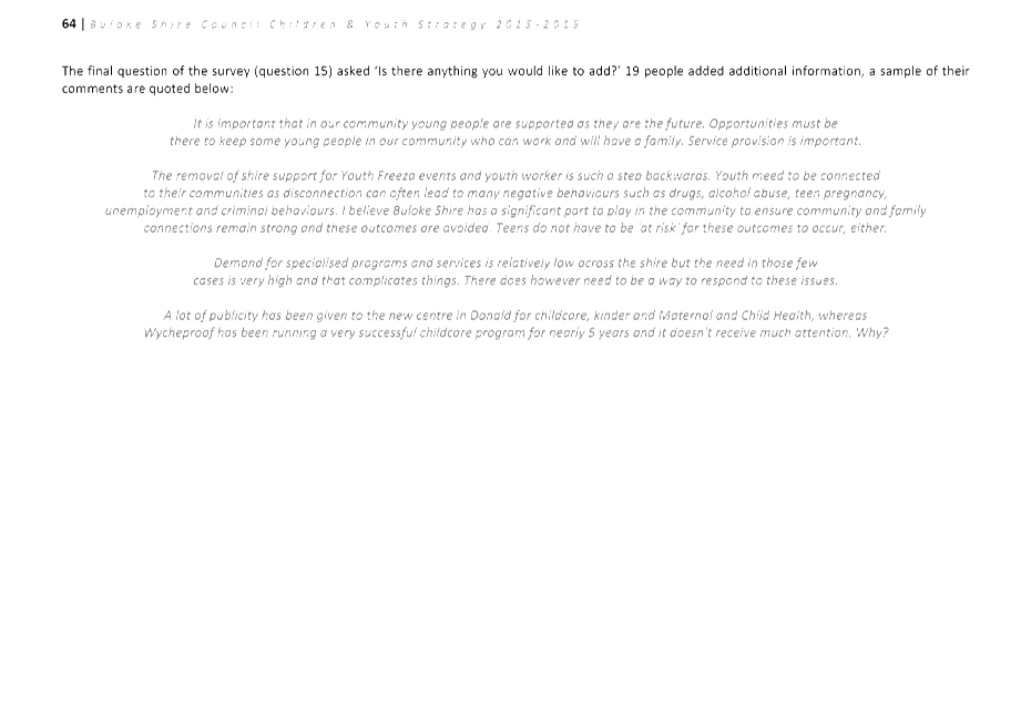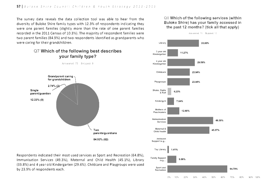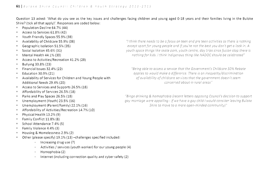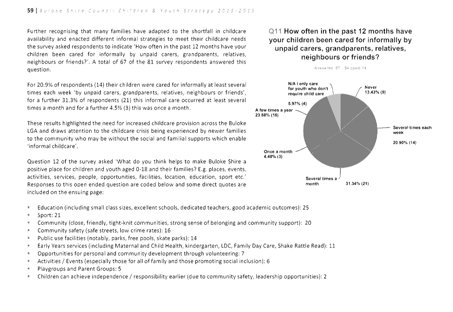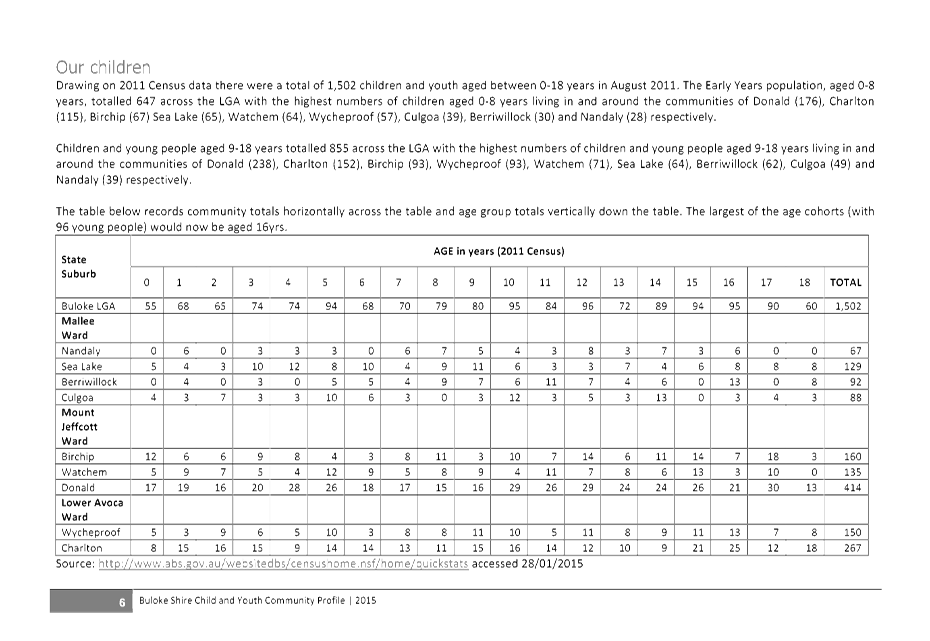 The draft Children and Youth Strategy 2015-2019 is an integrated whole-of-Council approach to ensure that children, young people and their families are understood, valued, supported and included in community life in Buloke.