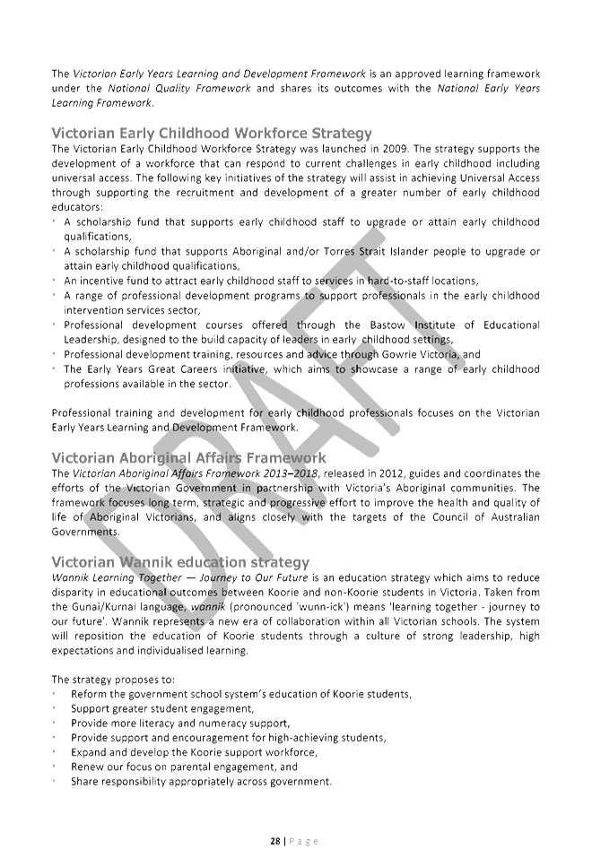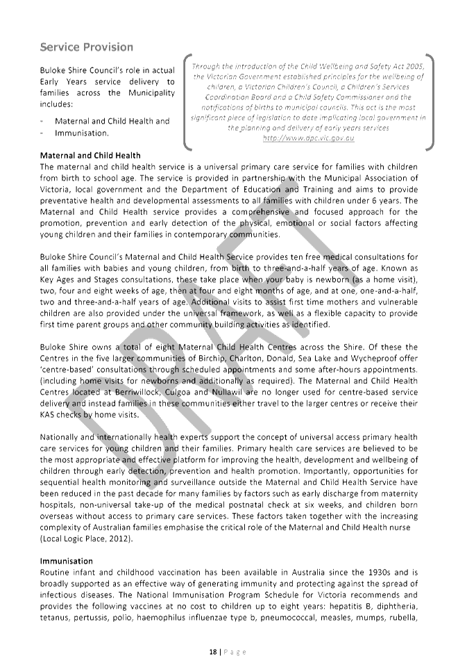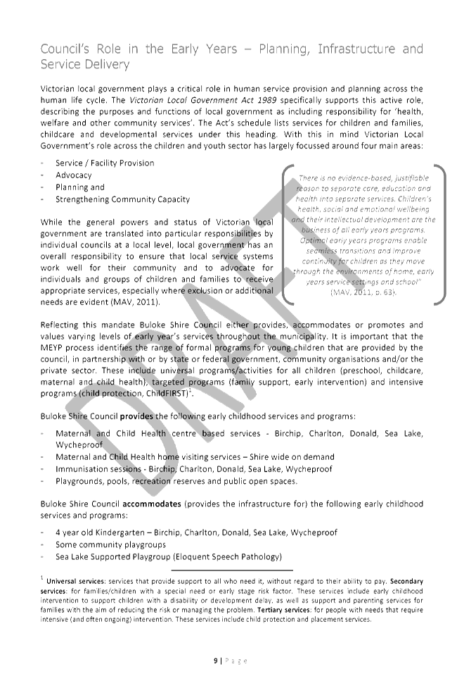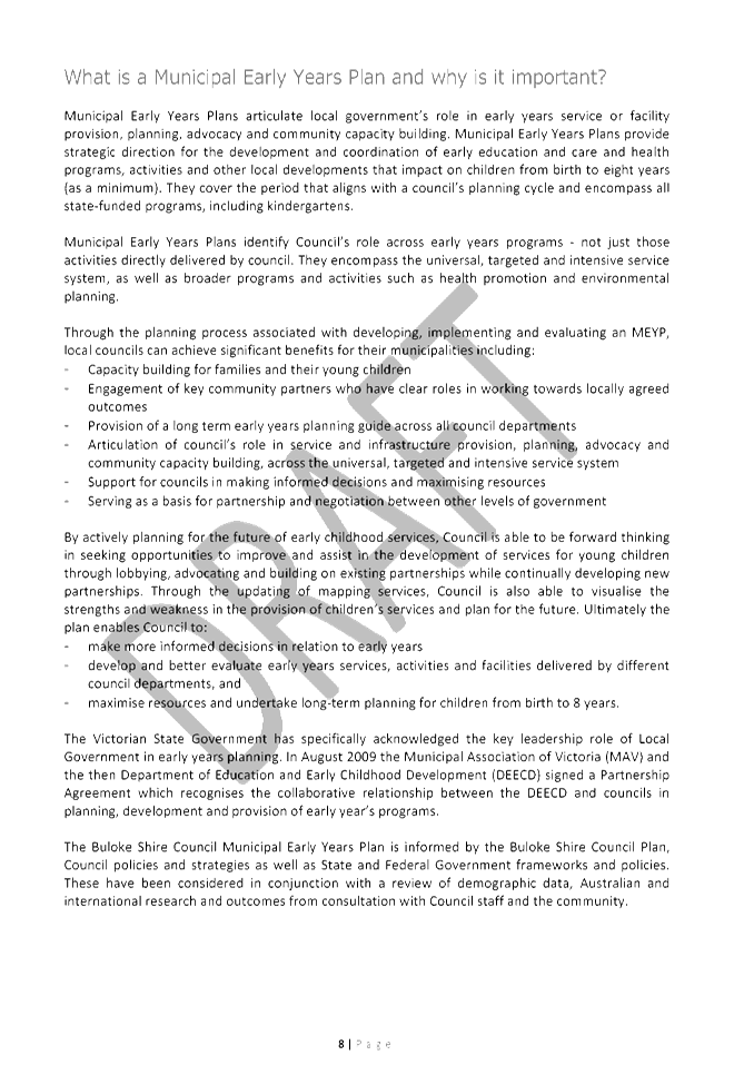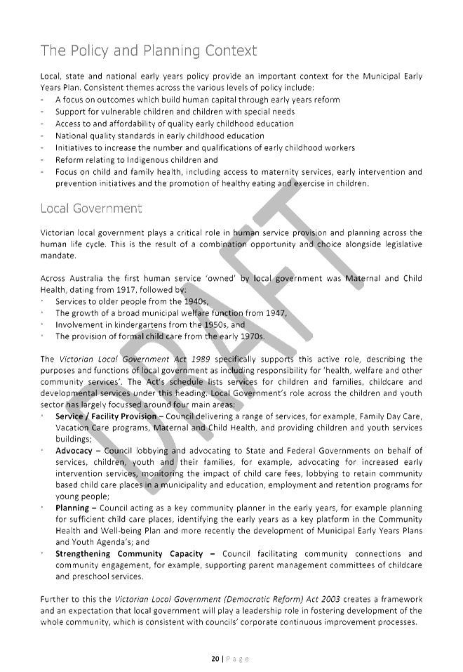 The draft Municipal Early Years Plan articulates local government’s role in early years services and it provides strategic direction for the development and coordination of early education, care and health programs, activities and other local developments that impact on children from birth to eight years. It is a universal document, not limited to Council’s statutory considerations.