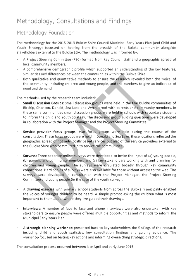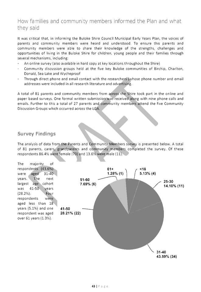 The draft plan and strategy have been developed through the collation of available statistical data and extensive consultation with a range of community members across the shire, as well as stakeholders involved in service delivery to the age groups concerned.