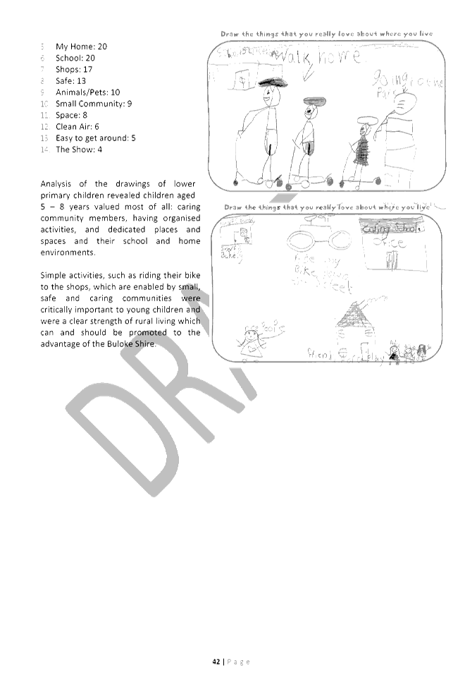 The draft plan and strategy involved extensive community consultation through a range of mediums including one-on-one discussions, small workshops, surveys, drawing exercises and the involvement of a project steering committee.
