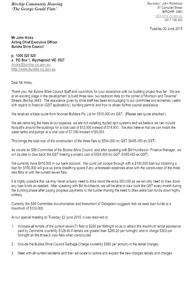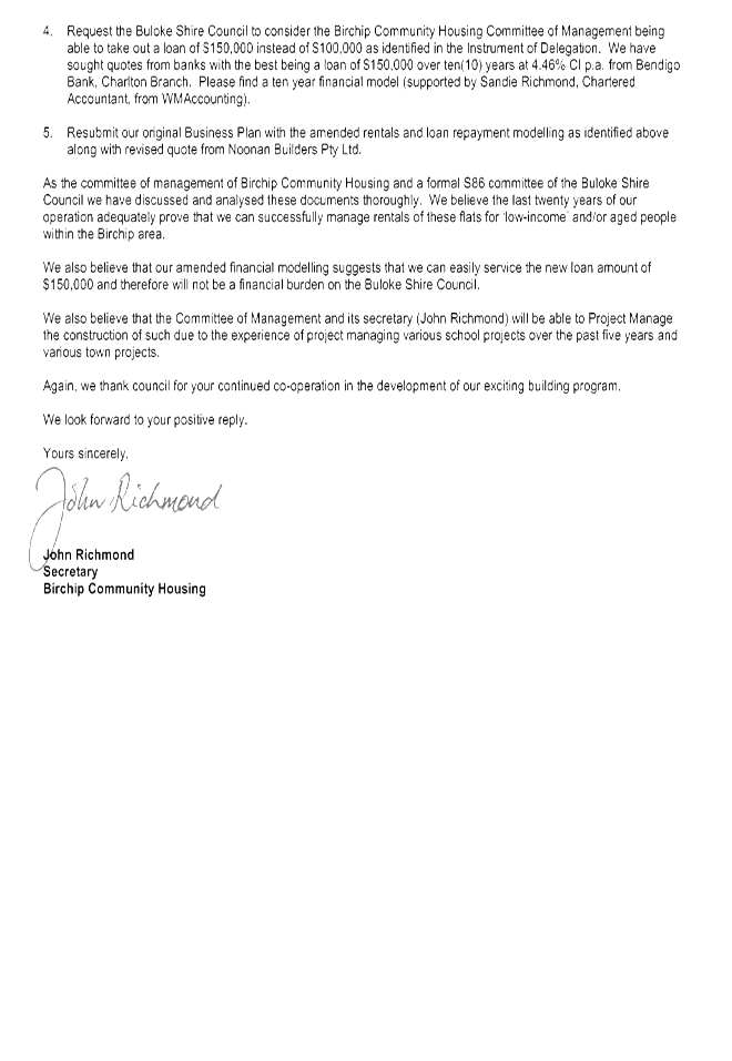 That Council: 1. Gives approval to the Birchip Community Housing Committee to seek a bank loan of up to $150,000 to construct additional community housing at 4 Morrison Street, Birchip.