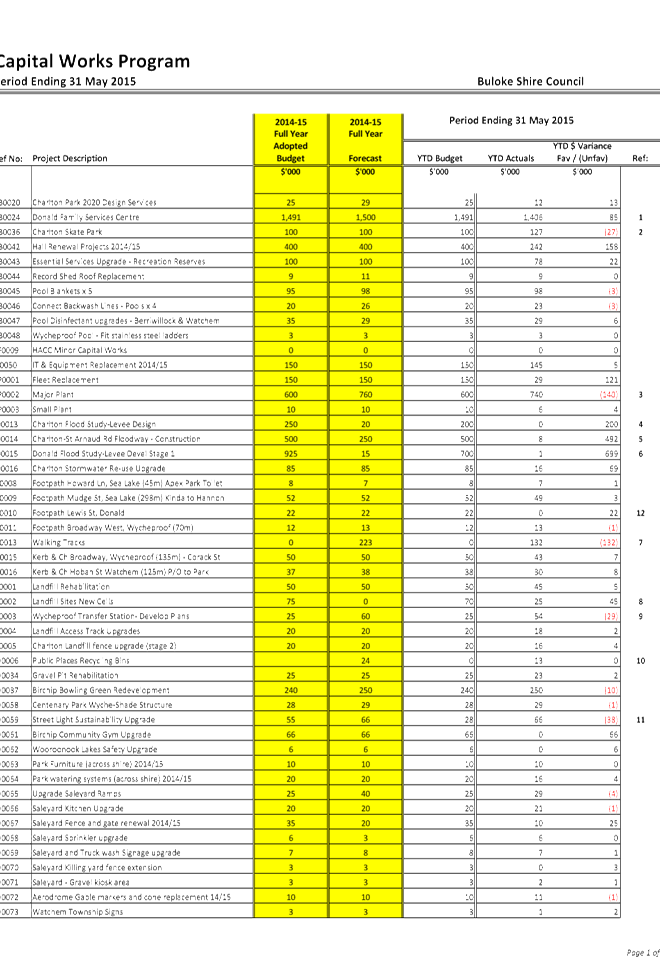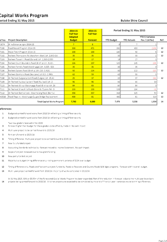 The Capital Works Program report again reflects that Council is making excellent progress in delivering the 2014/15 program. There are however a couple of major projects which will be carried forward into the 2015/16 year.