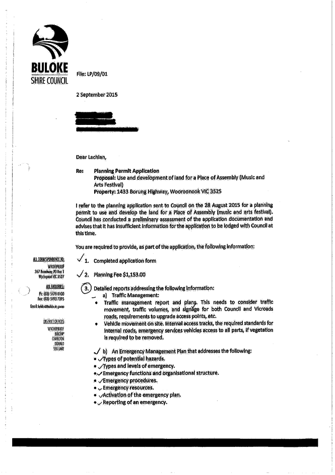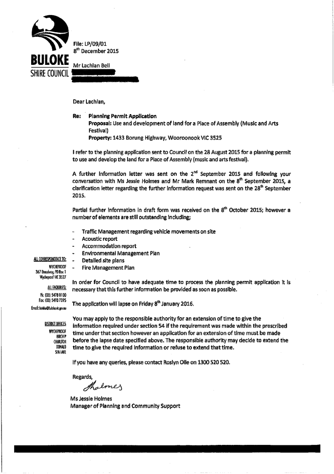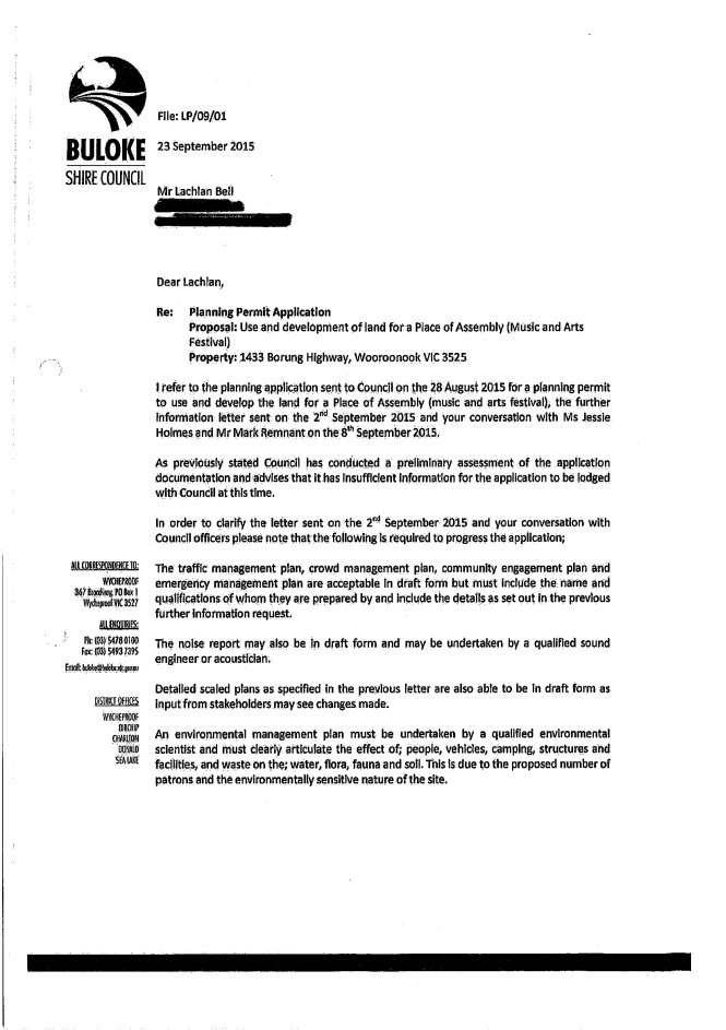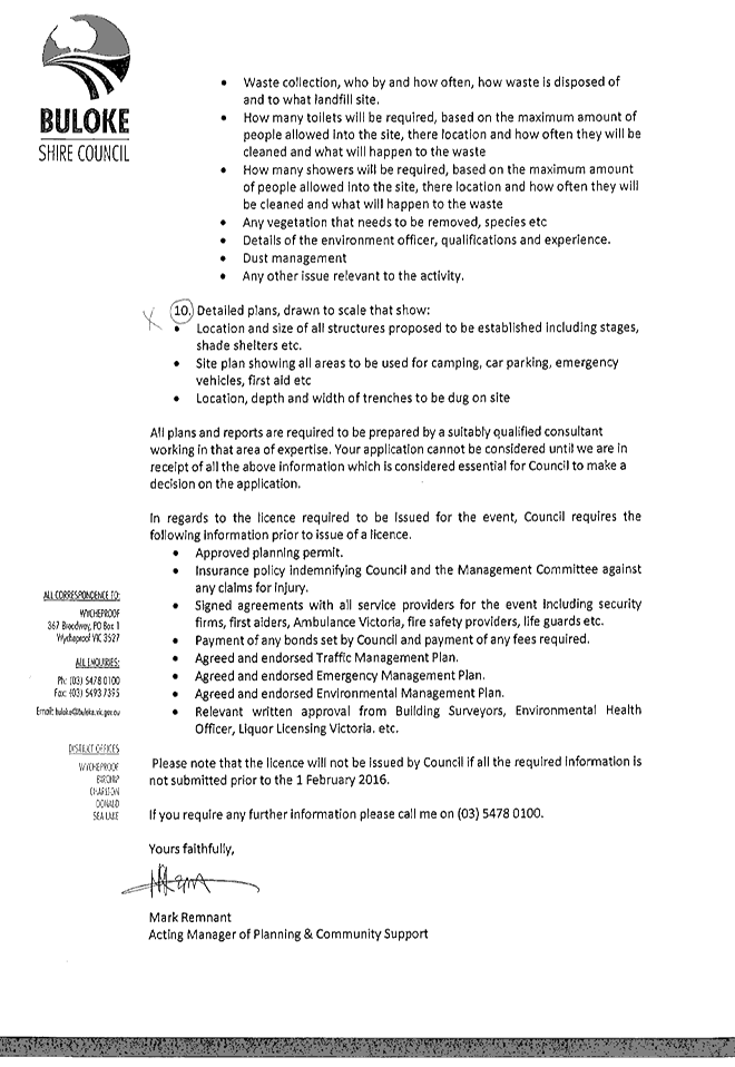 In addition to the letter sent on 2 September 2015, and several more from the Planning Officer, two letters from the Chief Executive Officer were sent to the applicant including on 24 July 2015 and 20 August 2015, clearly articulating the timeframes required in order for Council to make a decision on the use of the land for the purpose of a music and arts festival.