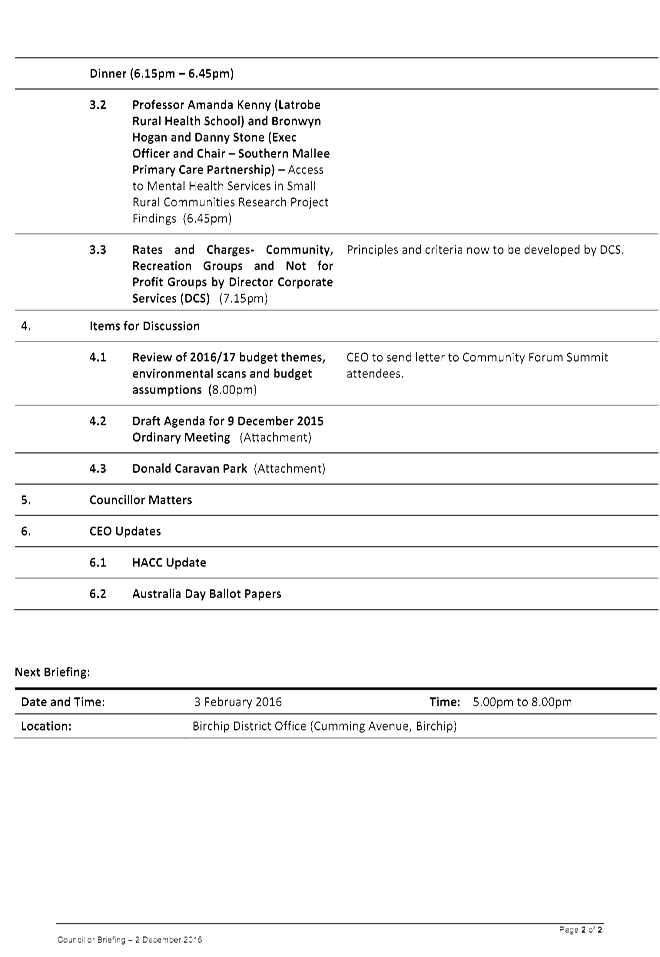 The next Ordinary Meeting of Council will be held in Wycheproof Supper Room, 367 Broadway, Wycheproof on Wednesday, 9 March 2016 at 7.00pm.