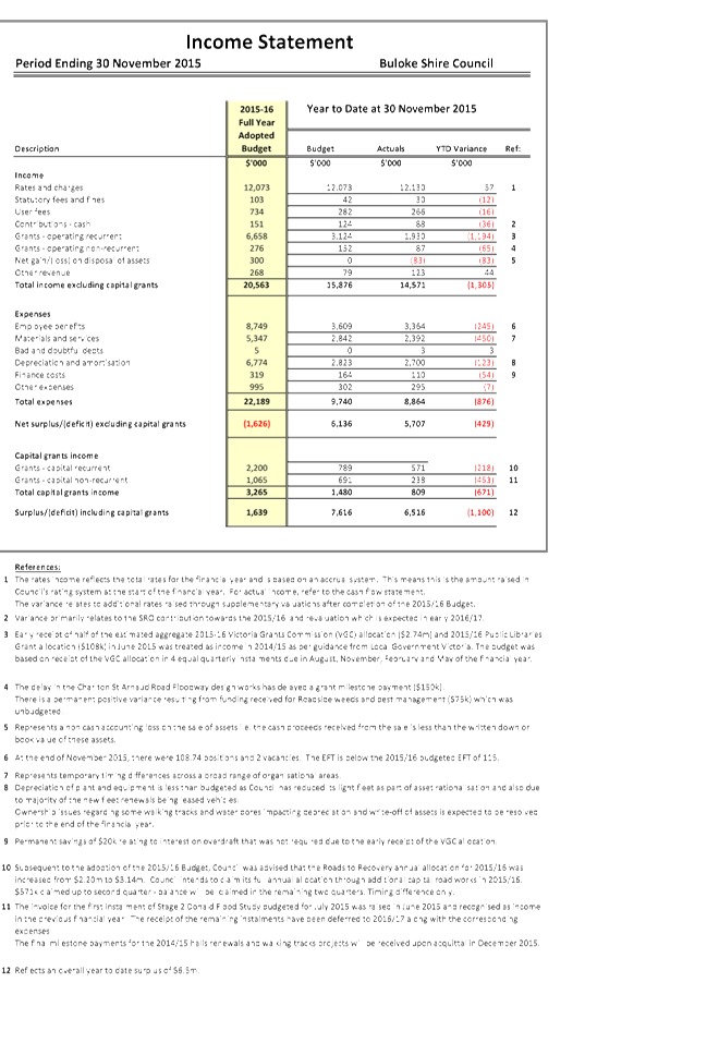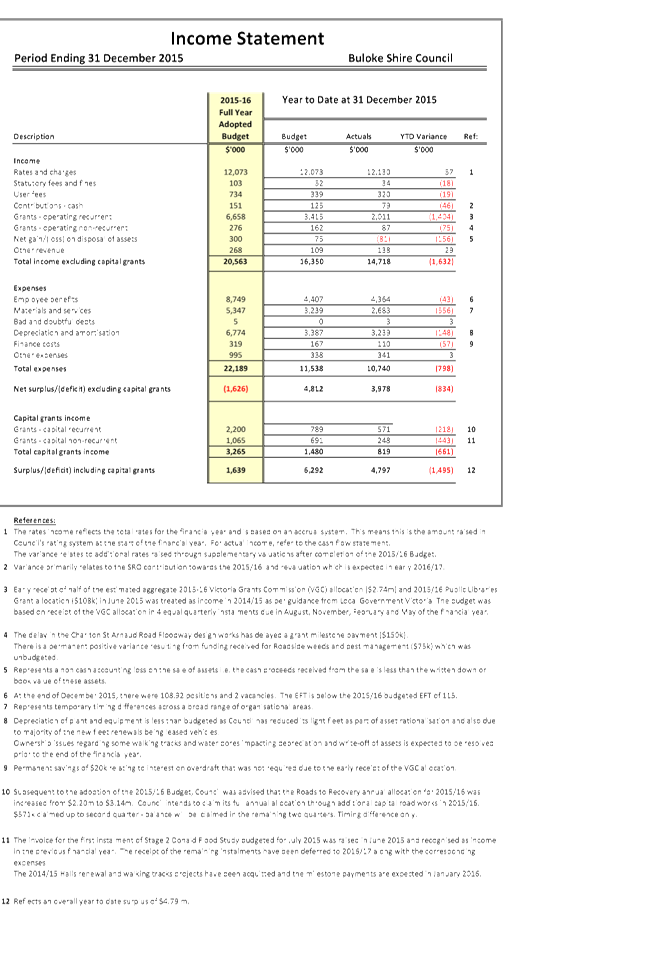 For the period ending 31 December 2015, the year to date (YTD) actual surplus is $4.79m. Total income excluding capital grants is $3.97m. The negative variance in operating income is due to the early receipt of half of the 2015/16 Victoria Grants Commission allocation in June 2015. Council had budgeted to receive this allocation in August 2015.