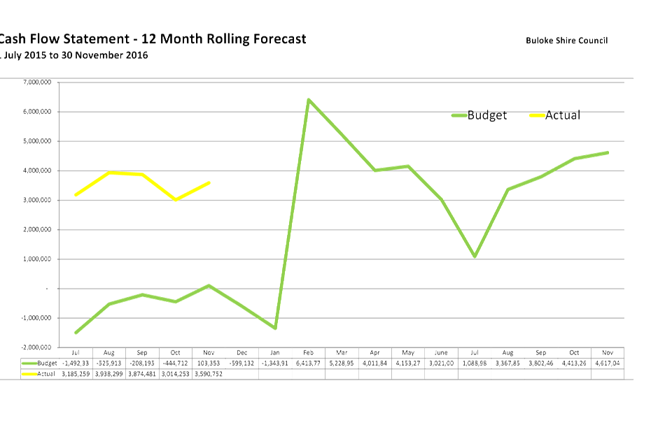 The Cash Flow Statement is formatted to show a rolling 12 month forecast. At 31 December 2015, the Cash Flow Statement shows Council with a bank balance of $2.18m. As previously stated this is due to the early receipt of grant money. The critical period for the cash flow will be the February period as this is the time when Council generally receives the majority of rate income.