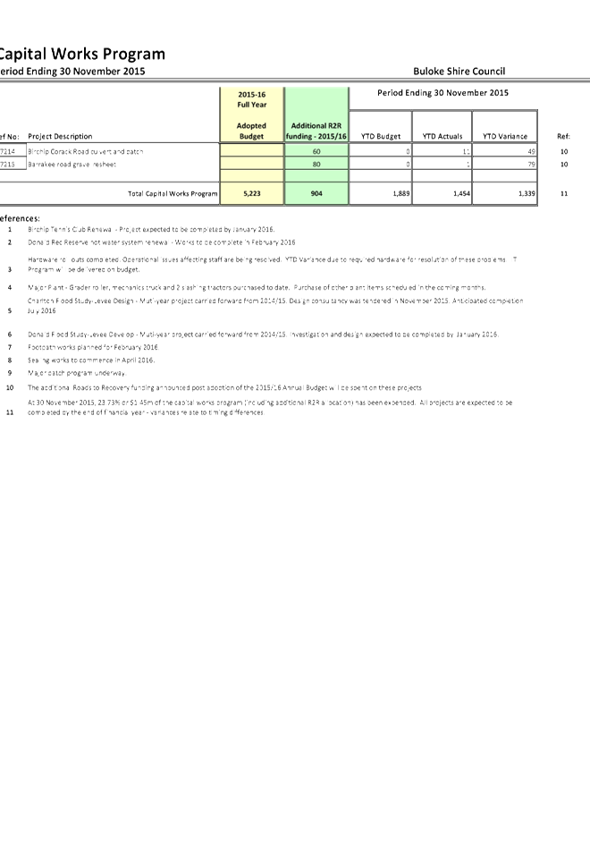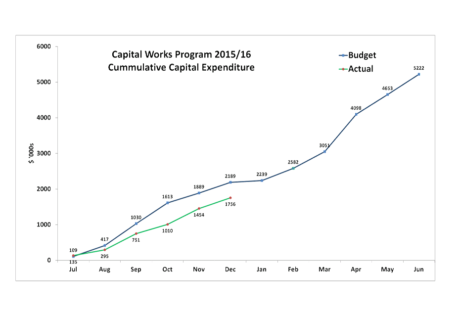The Capital Works Program report reflects 28.66% i.e. $1.76m of capital works (including additional R2R allocation) has been expended as at the 31 December 2015. Subsequent to the adoption of the 2015/16 Annual Budget, Council was advised that the Roads to Recovery annual allocation for 2015/16 was increased from $2.20m to $3.14m. Council intends to claim its full annual allocation through additional capital road works projects in 2015/16.
