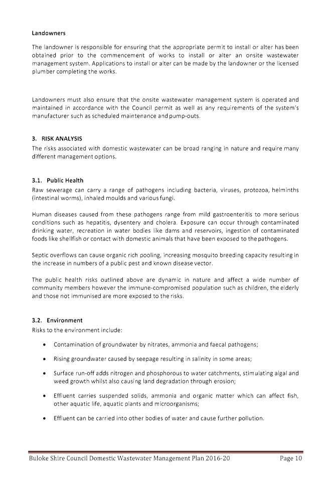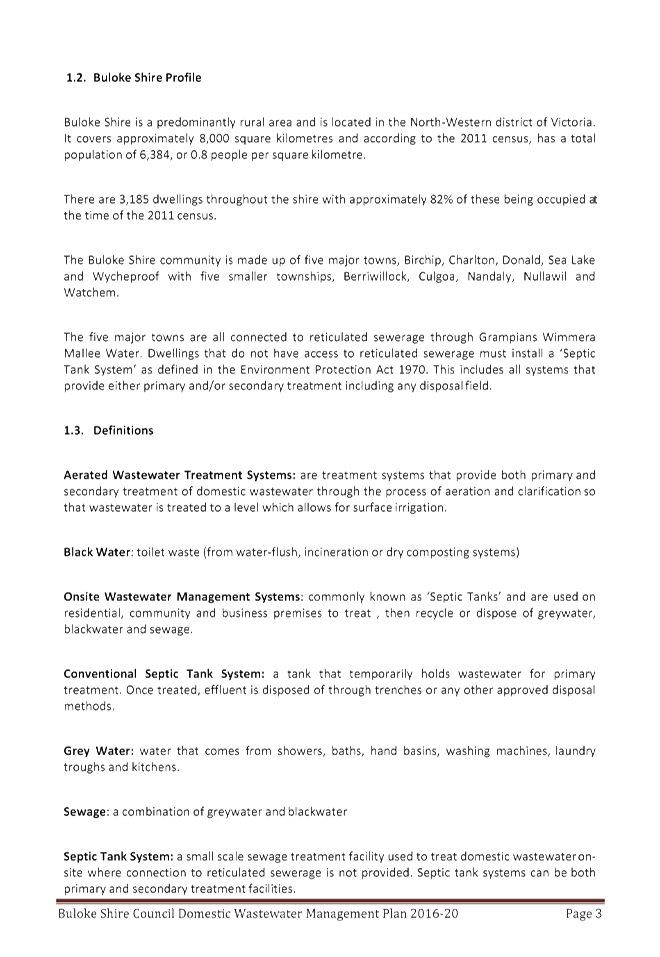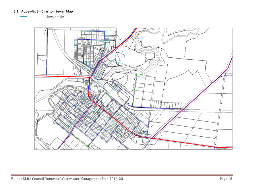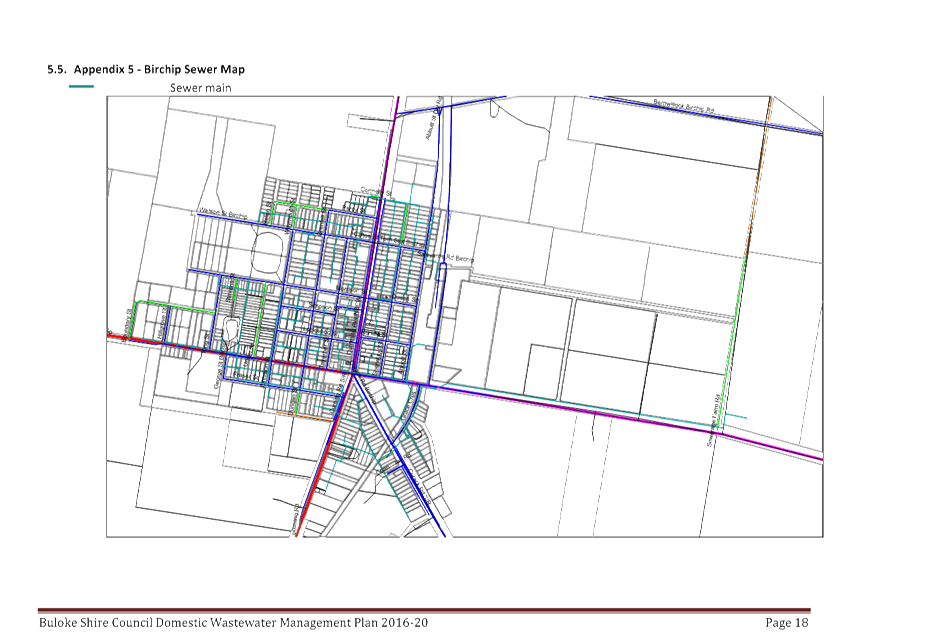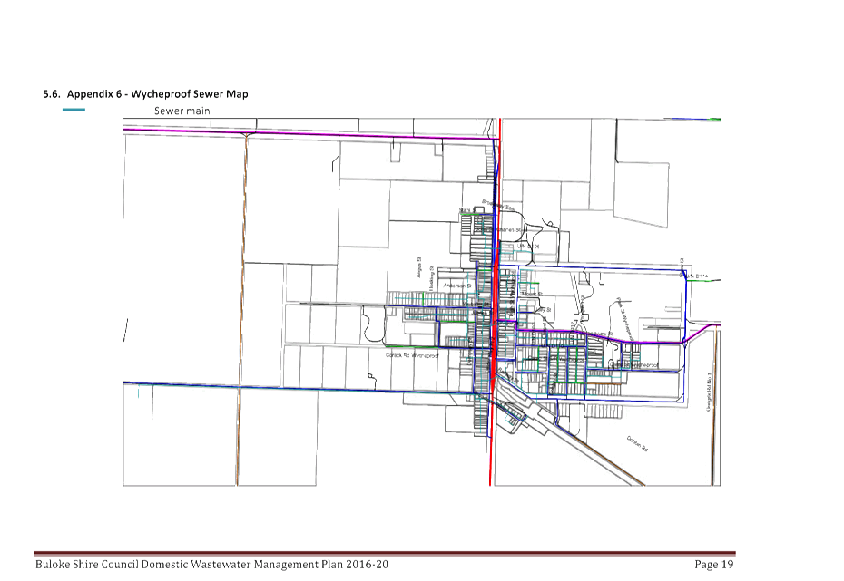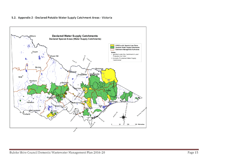 Buloke Shire Council does not have to take into account potable supply water catchment areas in the development of our DWMP, making the document substantially less onerous and the administration on our EHO substantially reduced. In addition, the five smaller townships are not advocating for sewer construction and this is unlikely to occur given the significant cost of the required infrastructure.