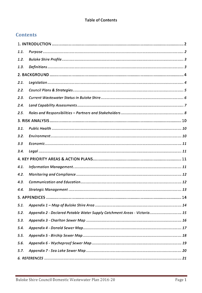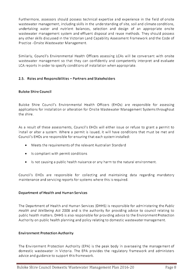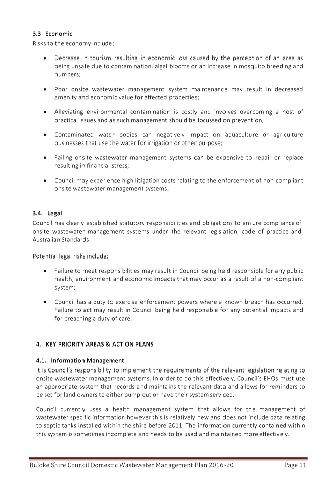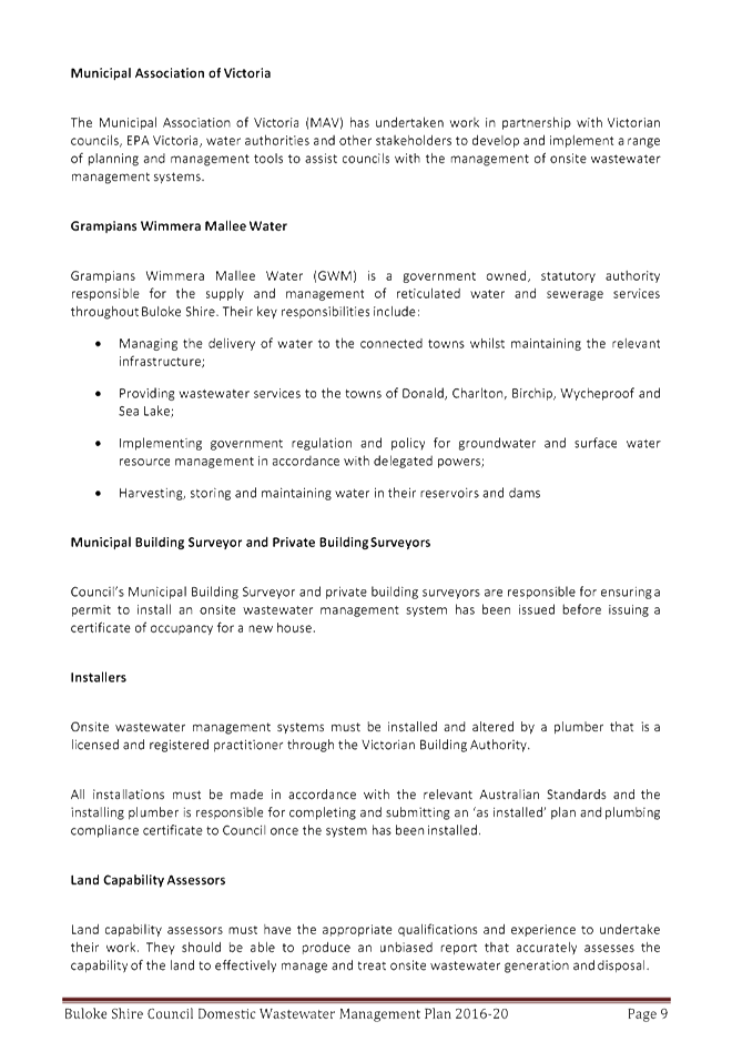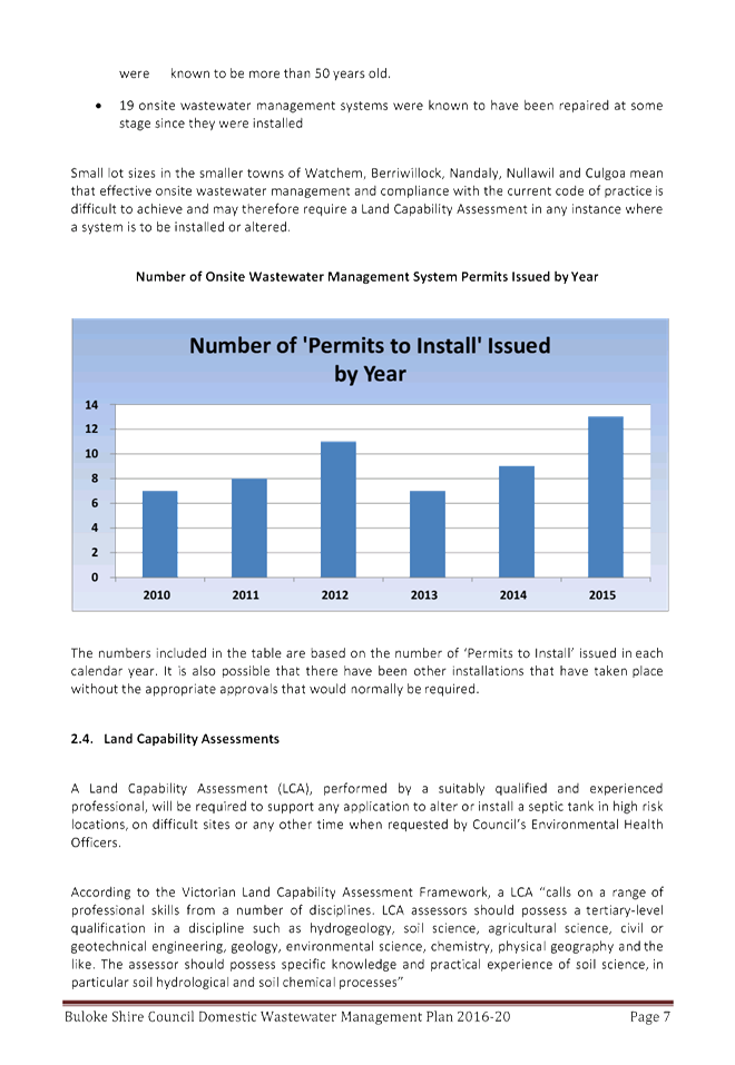 Buloke Shire Council does not have to take into account potable supply water catchment areas in the development of our DWMP, making the document substantially less onerous and the administration on our EHO substantially reduced. In addition, the five smaller townships are not advocating for sewer construction and this is unlikely to occur given the significant cost of the required infrastructure.
