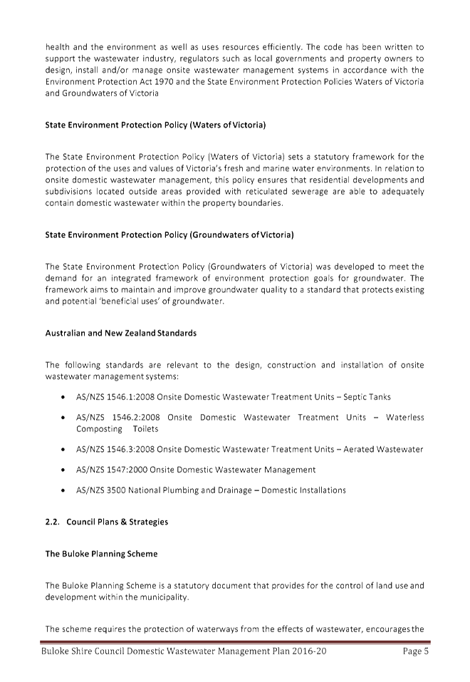 The State Environment Protection Policy (Waters of Victoria) states that a municipal council must develop and implement a Domestic Wastewater Management Plan that: