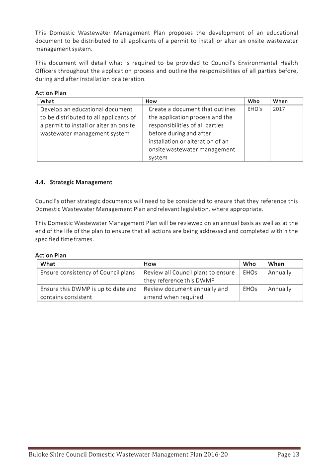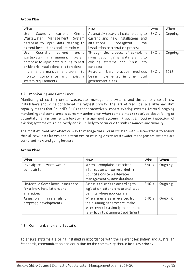 The draft DWMP has a number of strategic actions that can better assist the administration of onsite wastewater management systems and work with the community to ensure that property owners are aware of their responsibilities.
