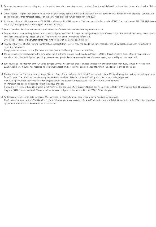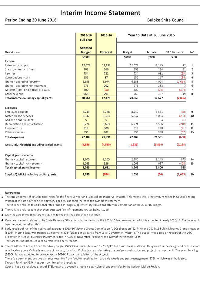 For the period ending 30 June 2016, the year to date (YTD) deficit is $54k. Total income excluding capital grants is a deficit of $3.85m. The negative variance in operating income is due to the early receipt of half of the 2015/16 Victoria Grants Commission allocation in June 2015. Council had budgeted to receive this allocation in August 2015. The forecast shows a deficit of $0.88m which is due to this early allocation of income.