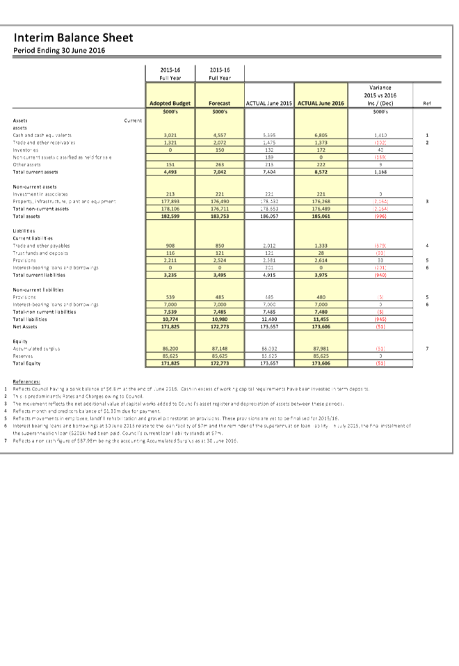 At the 30 June 2016, the Balance Sheet shows Council’s bank balance at $6.8m.