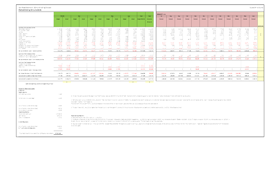 The Cash Flow Statement is formatted to show a rolling 12 month forecast. At 30 June 2016, the Cash Flow Statement shows Council with a bank balance of $6.8m. The cash flow forecast has been amended to reflect movements in the income statement. Cash held at 30 June 2016 includes restricted grants funds held for the completion of capital works projects.
