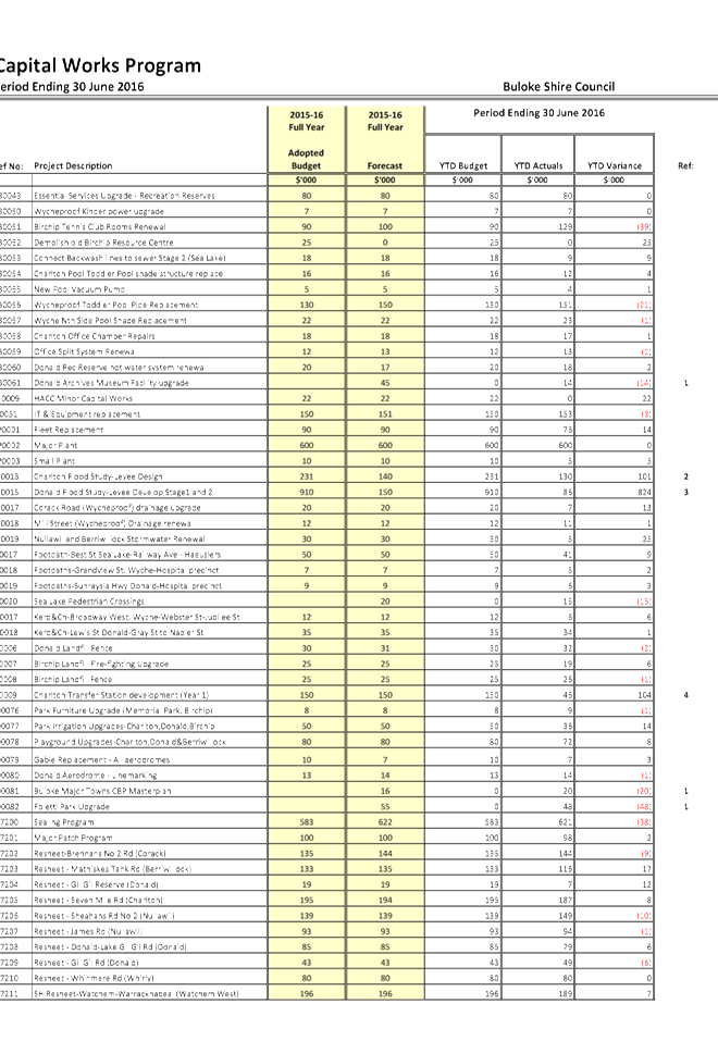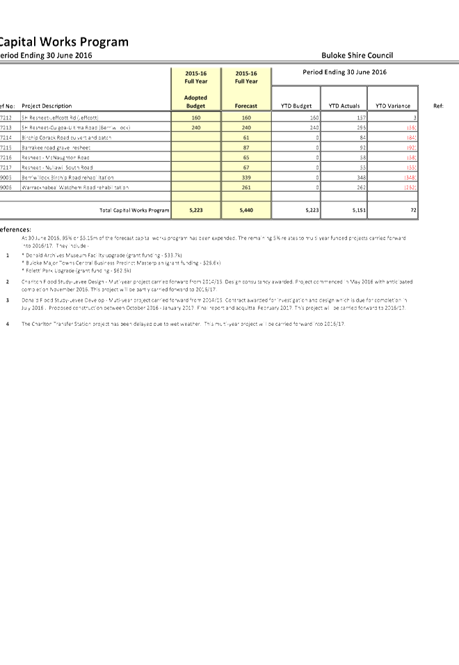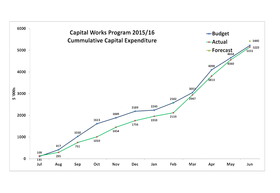 The Capital Works Program report reflects 95% of forecasted capital works i.e. $5.15m of capital works (including additional R2R allocation) has been expended as at the 30 June 2016. Subsequent to the adoption of the 2015/16 Annual Budget, Council was advised that the Roads to Recovery annual allocation for 2015/16 was increased from $2.20m to $3.14m. Council has claimed its full annual allocation through additional capital road works projects in 2015/16.